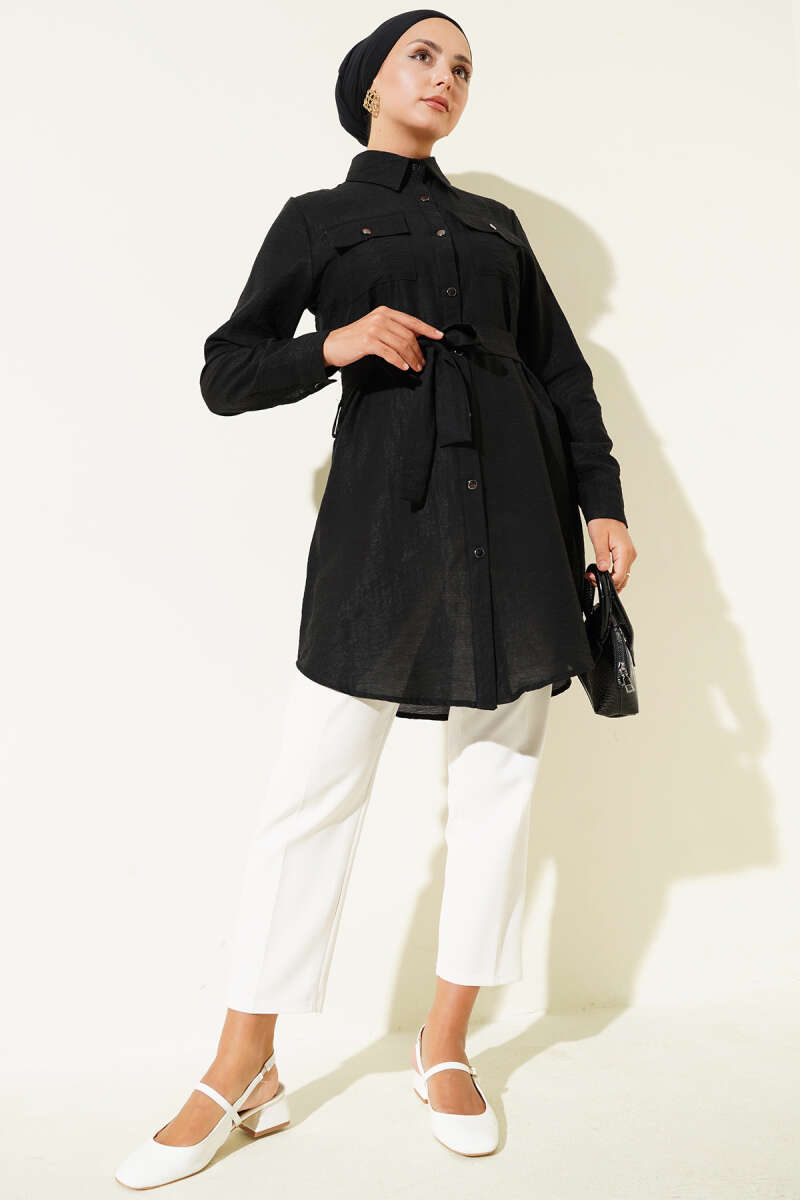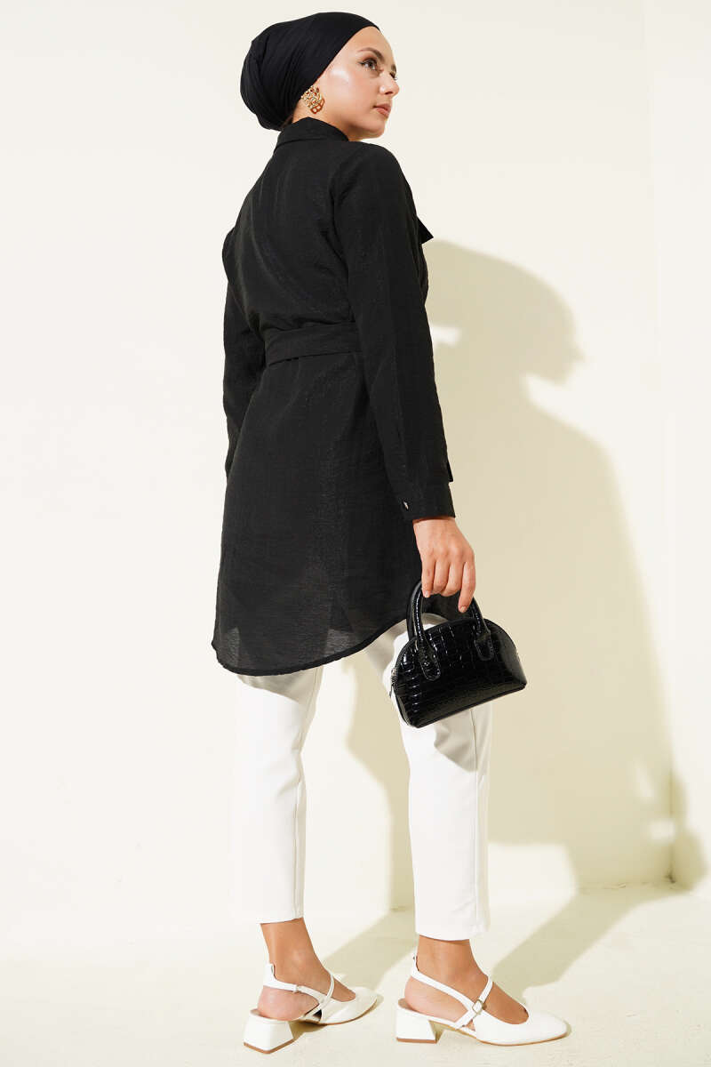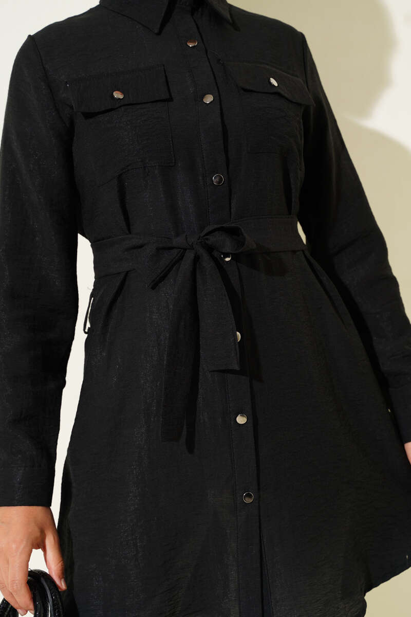 Çift Cepli Belden Bağlamalı Tunik Siyah