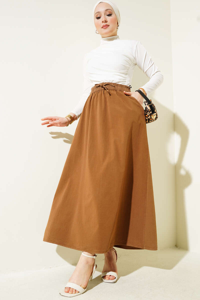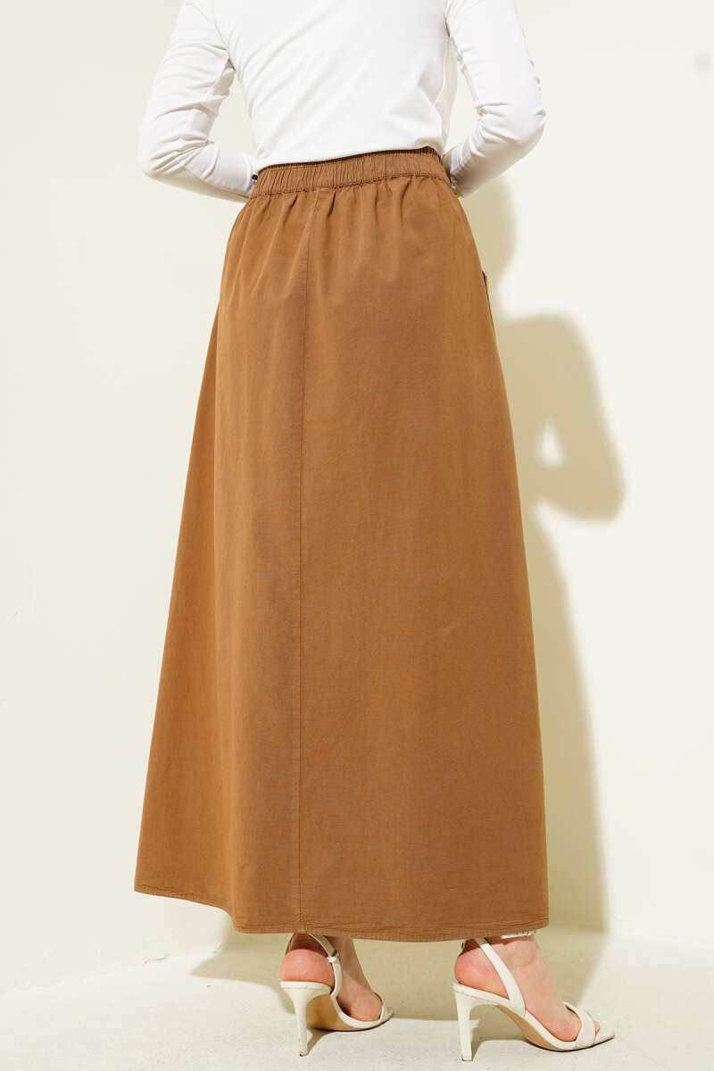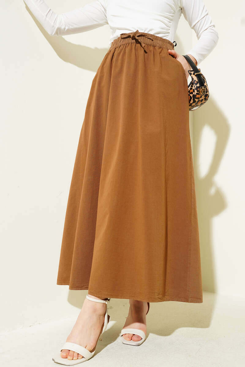 Çift Cepli Beli Lastikli Etek Taba