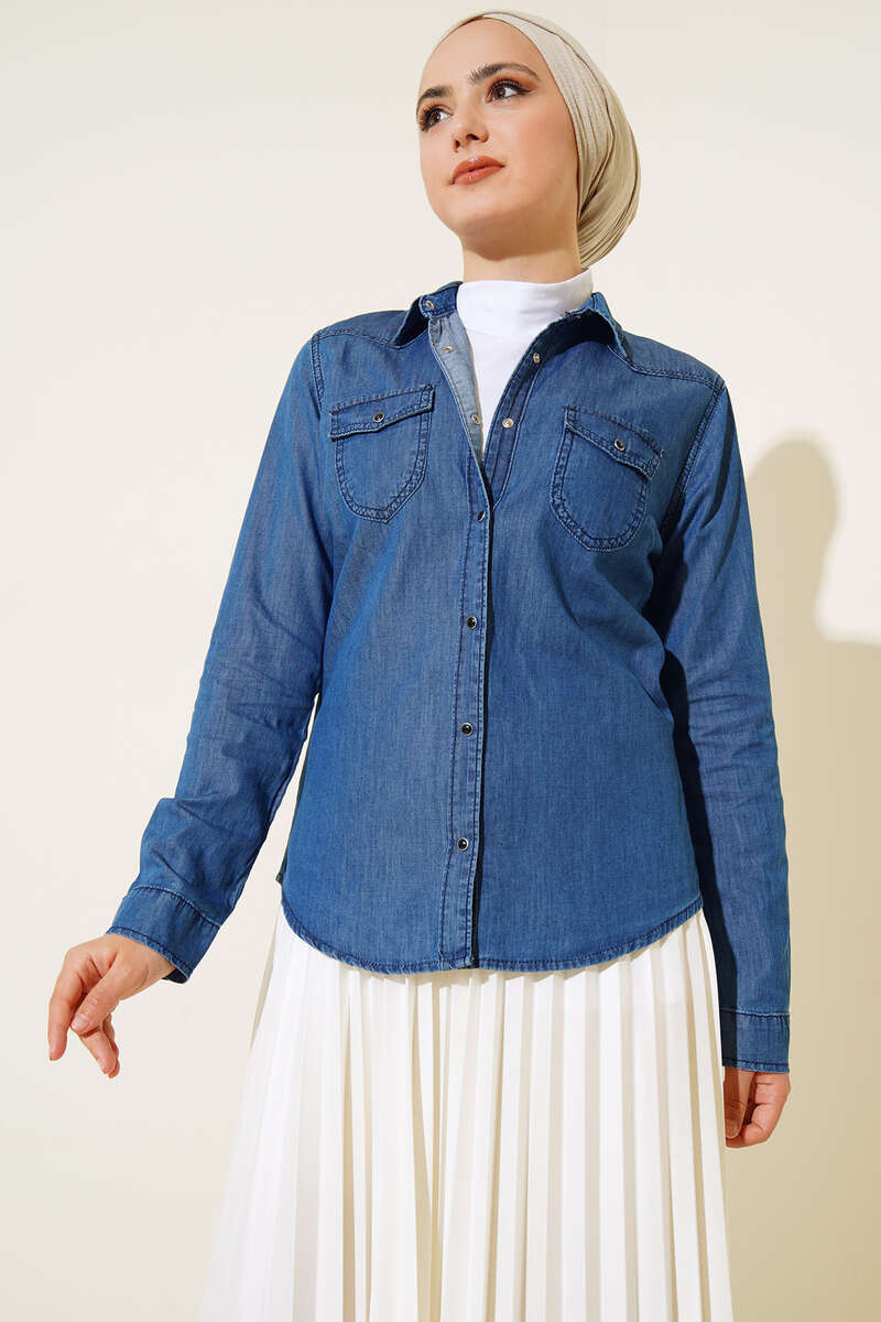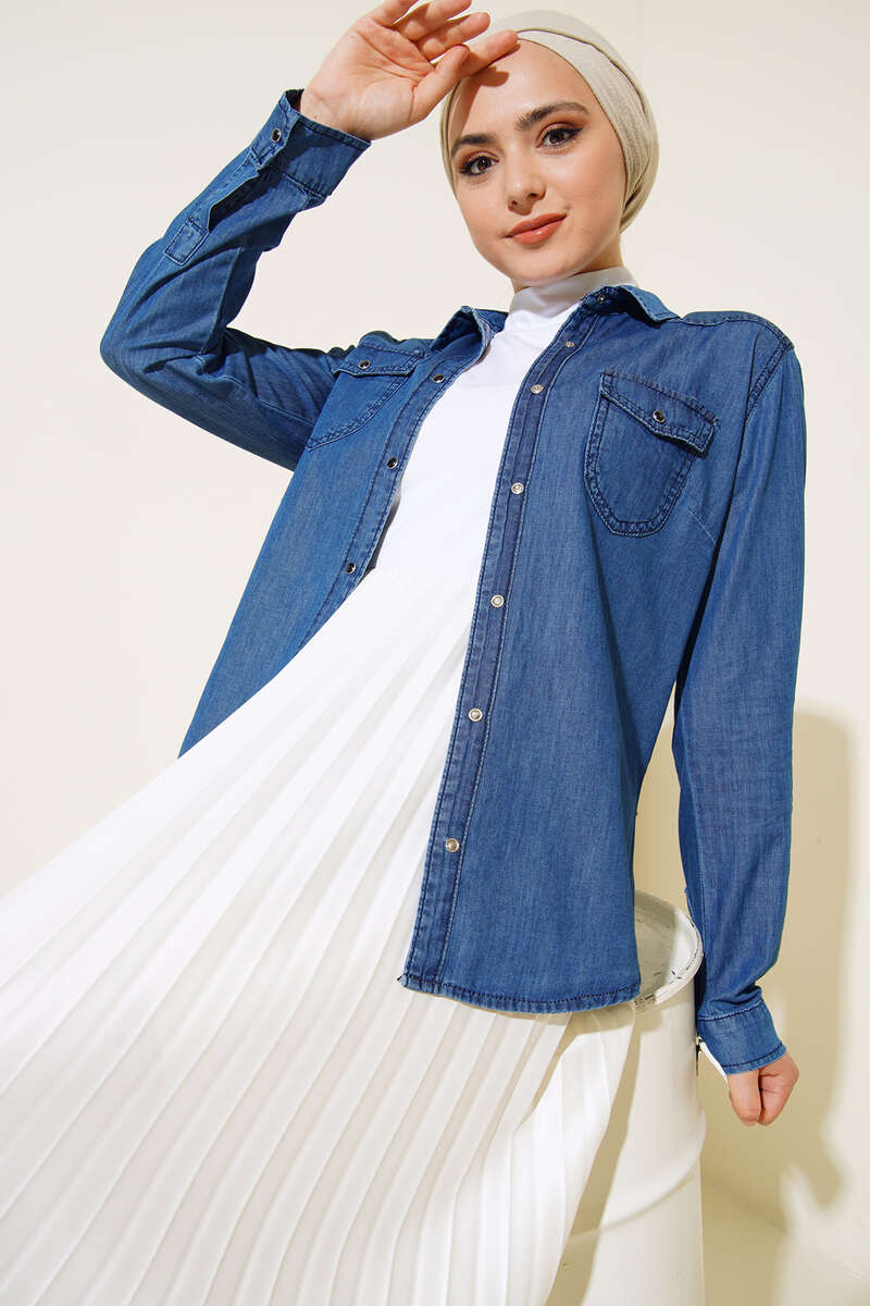 Yeni sezon gömleğimiz şık tarzıyla sizlerle. Gömleğimizin iki adet cebi bulunmaktadır. Önü ve bileği çıt çıt düğmeli olan gömleğimiz bu yaz favoriniz olacak.