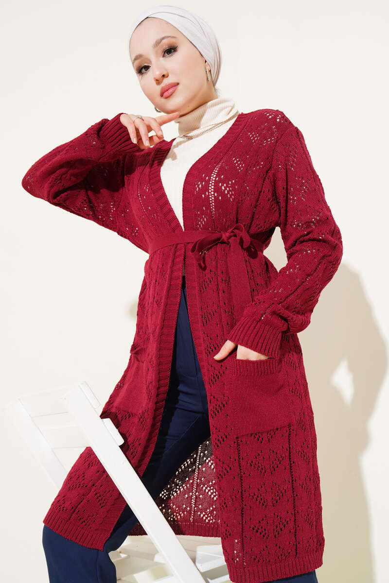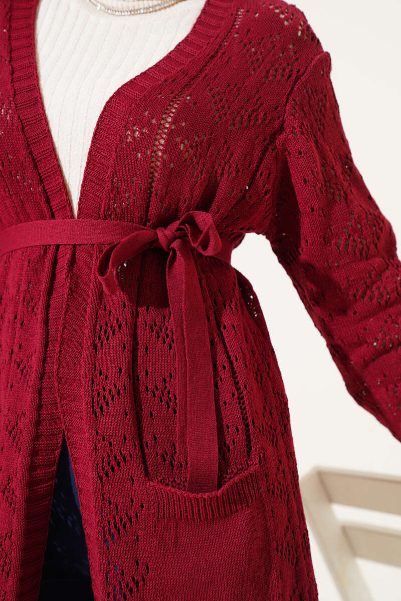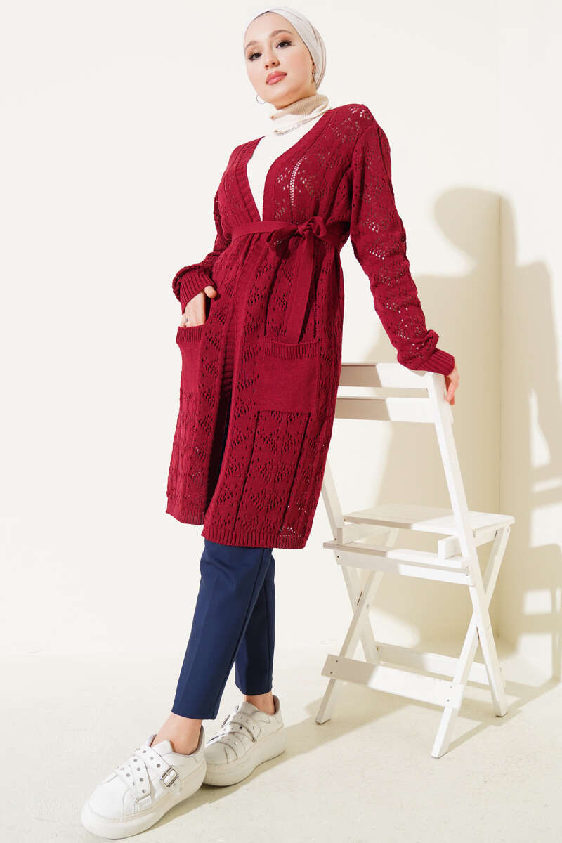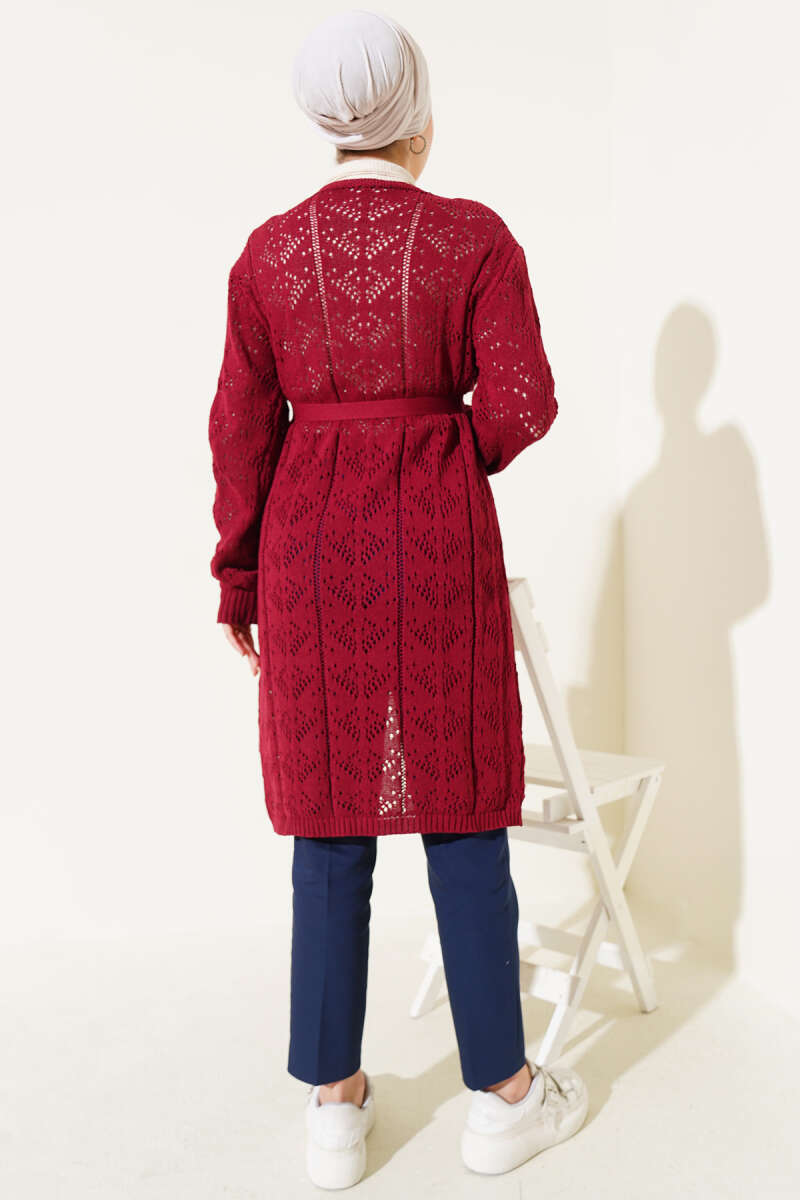 Şal Yaka Örgü Desenli Uzun Triko Hırka Bordo