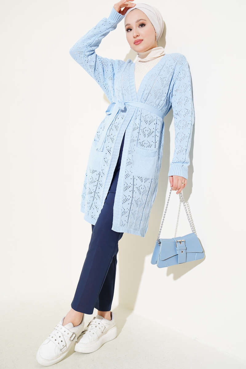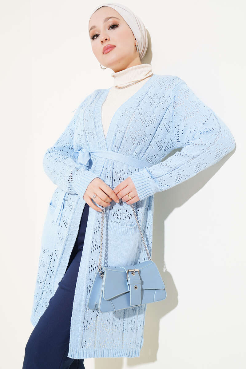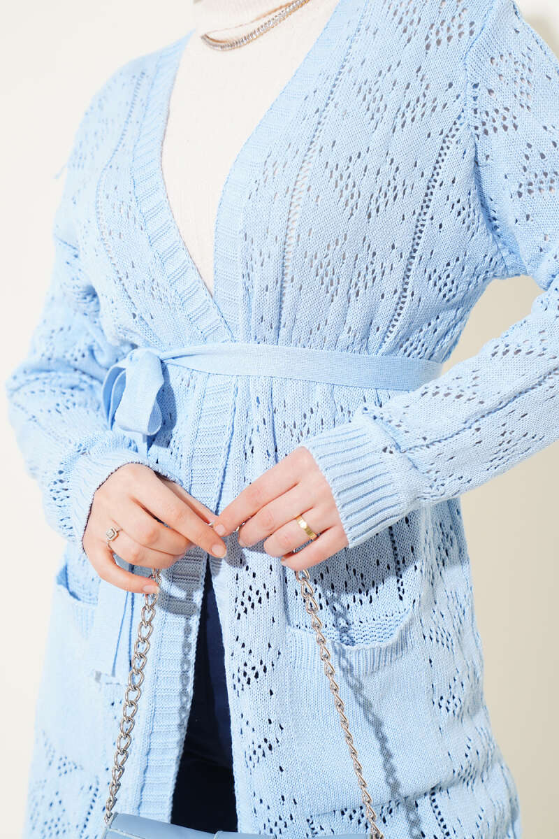 Çift Cepli Delikli Kuşaklı Triko Hırka Ekru