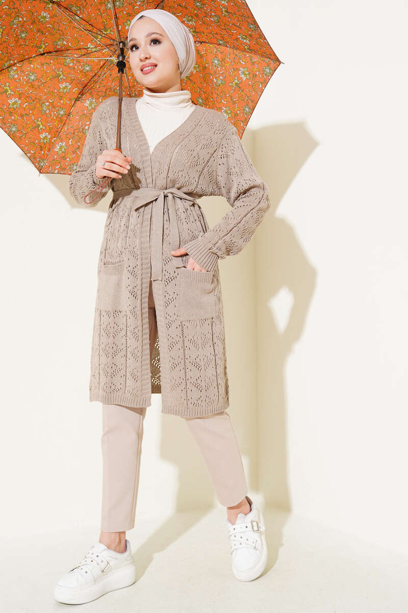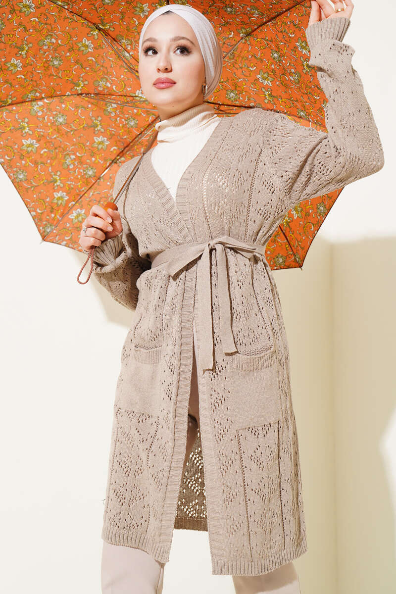 Dalmaçya Desen İncili Kısa Triko Hırka Krem