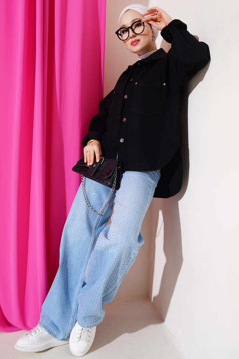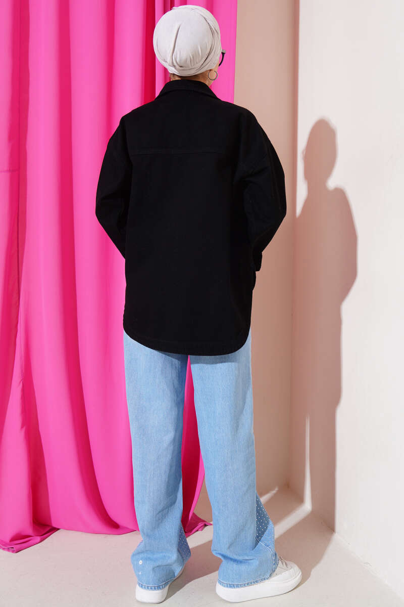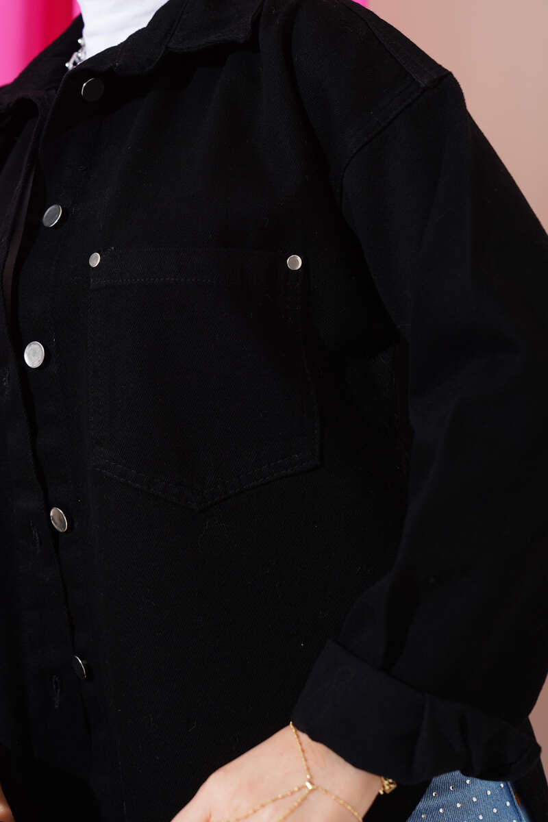 Çift Cepli Düğmeli Kot Ceket Siyah