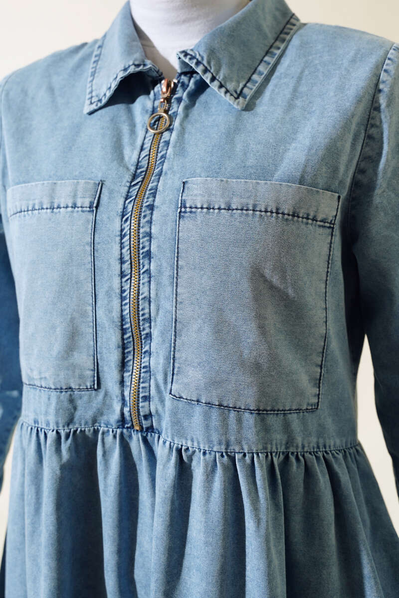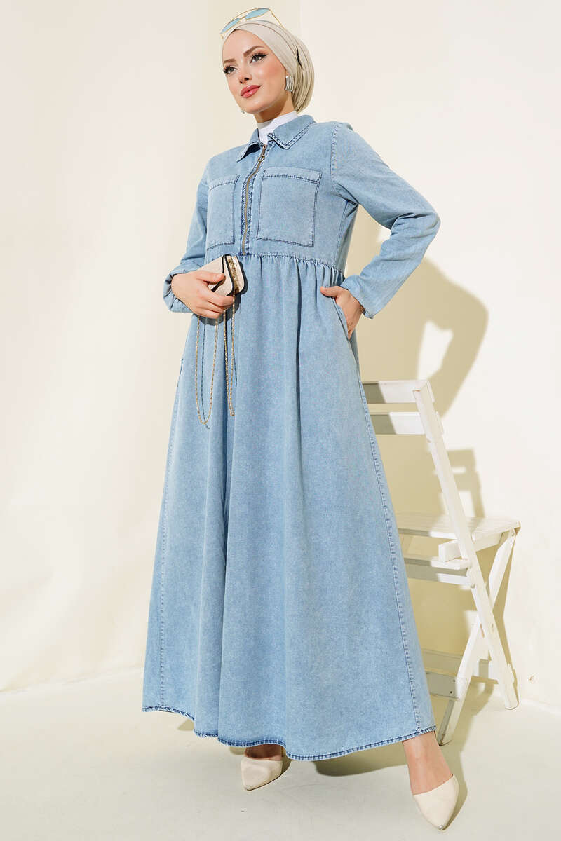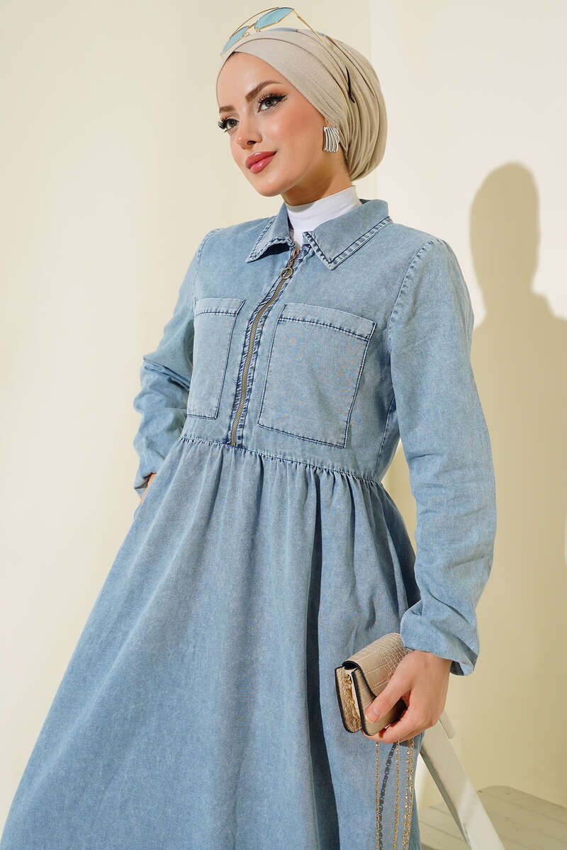 Çift Cepli Fermuarlı Kot Elbise Kot Mavisi