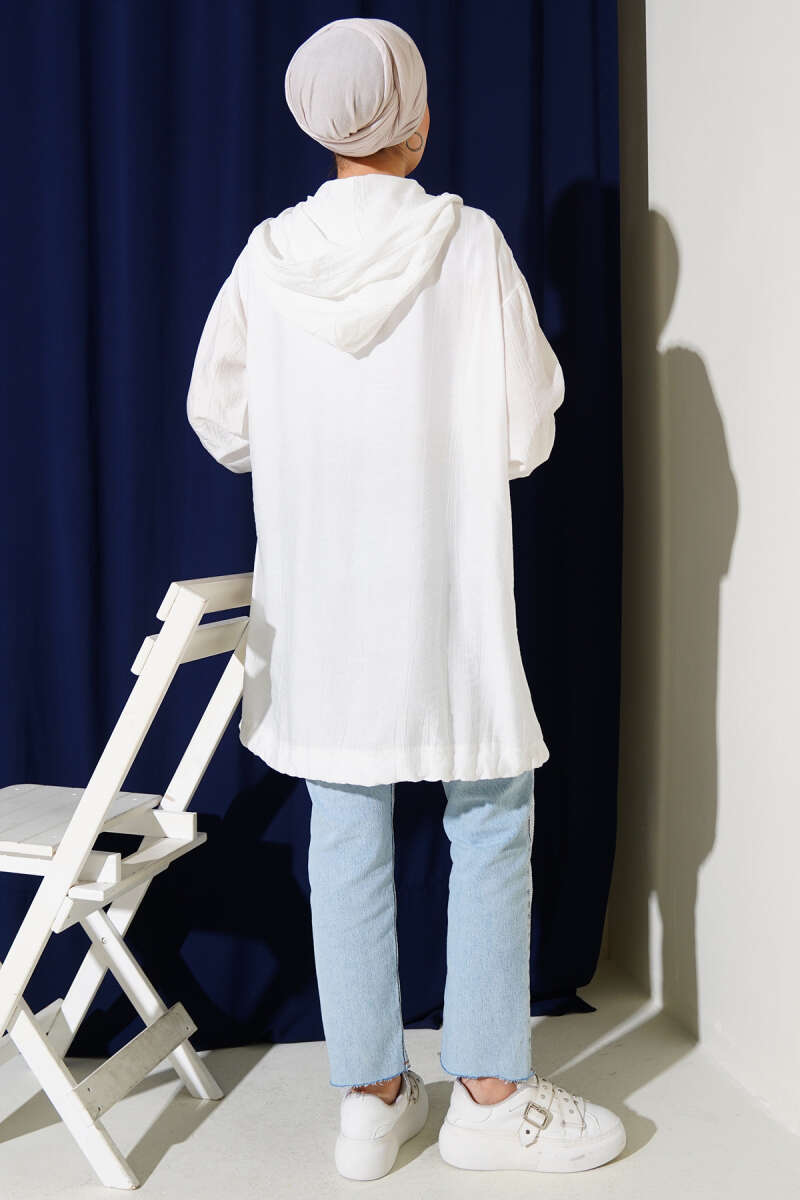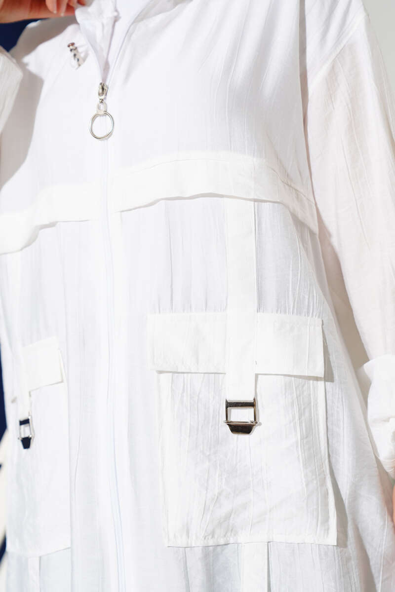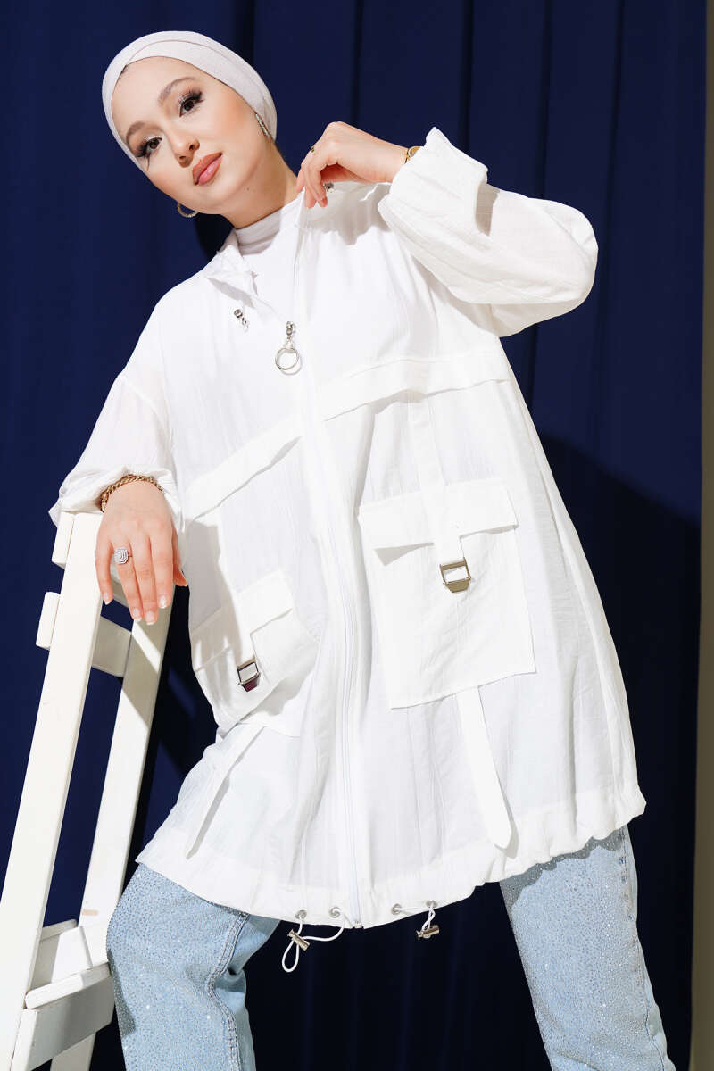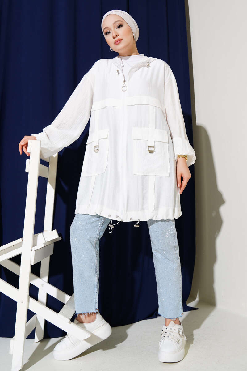 Çift Cepli Kapüşonlu Kap Beyaz