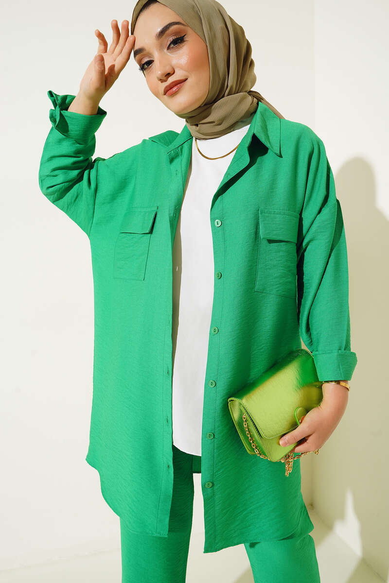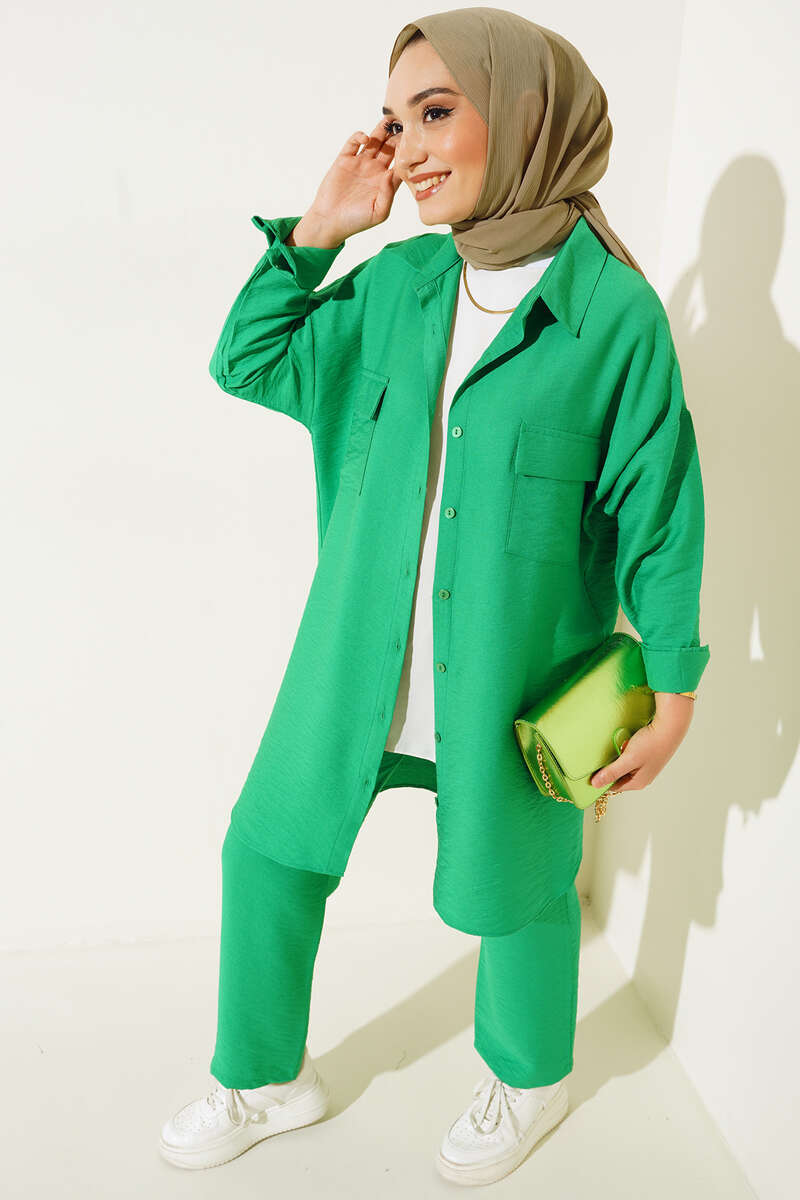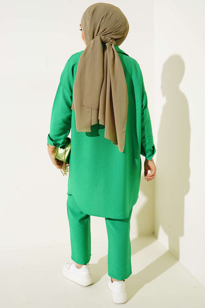 Yeni sezon ayrobin ikili takımımız tunik ve pantolondan oluşmaktadır.  Ön kısmı düğmeli olan takımımız iki adet cebe sahiptir. Tuniğimiz uzun yapısıyla hem rahat hem şık bir modeldir. Renk seçenekleri bulunmaktadır.