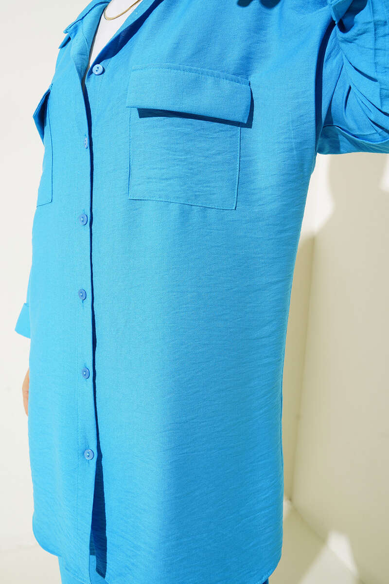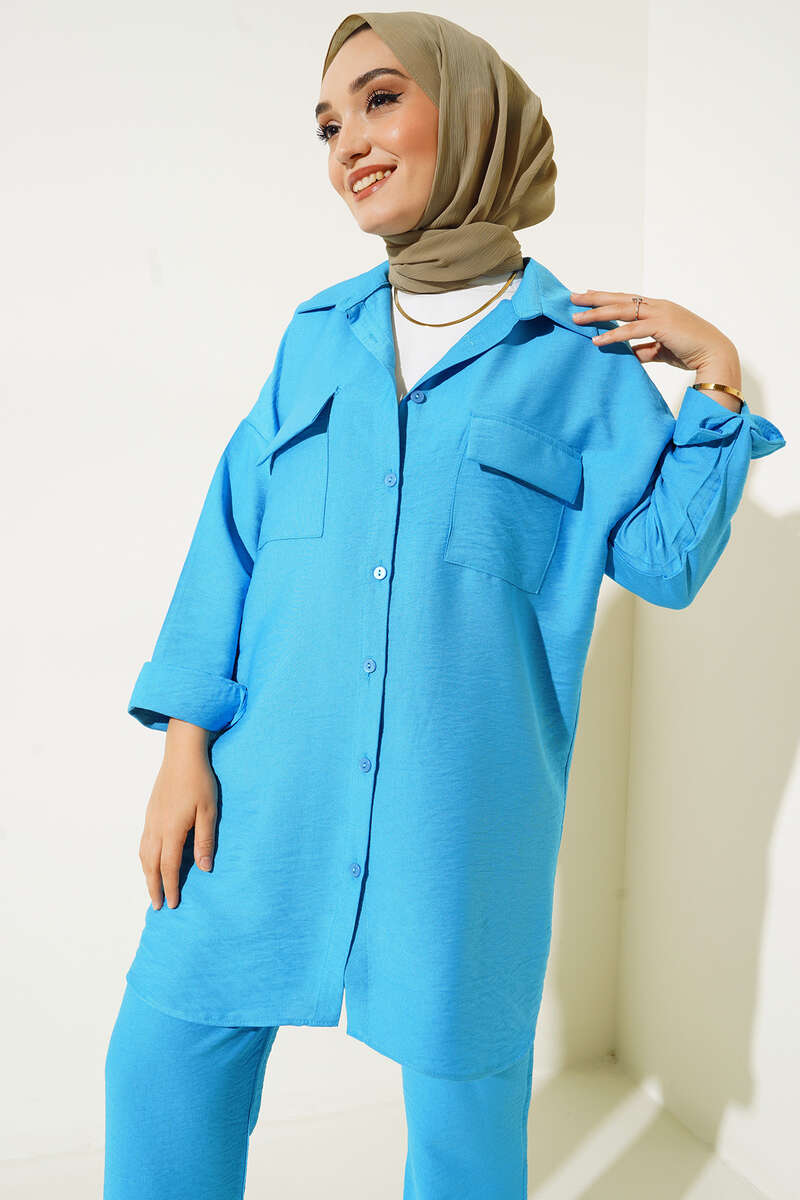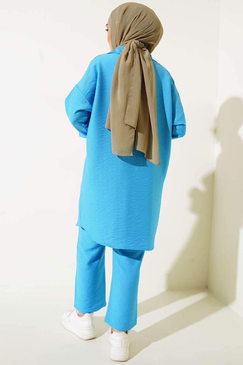 Yeni sezon ayrobin ikili takımımız tunik ve pantolondan oluşmaktadır.  Ön kısmı düğmeli olan takımımız iki adet cebe sahiptir. Tuniğimiz uzun yapısıyla hem rahat hem şık bir modeldir. Renk seçenekleri bulunmaktadır.