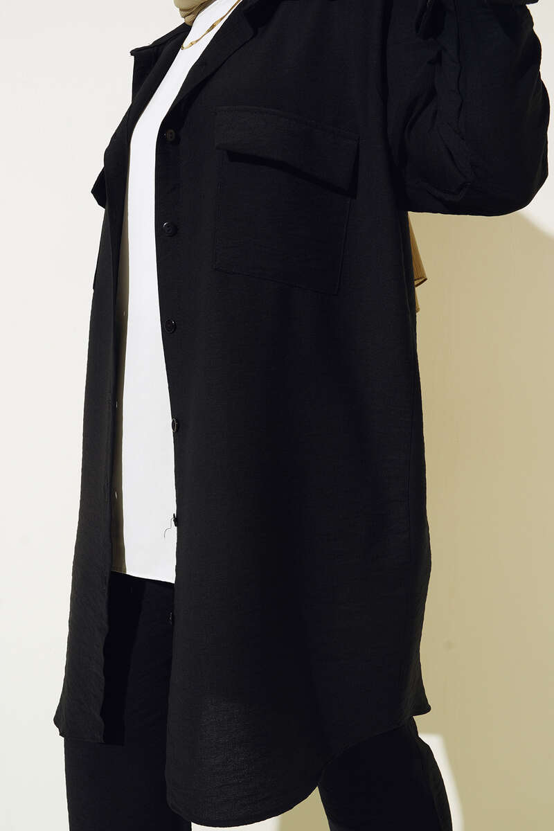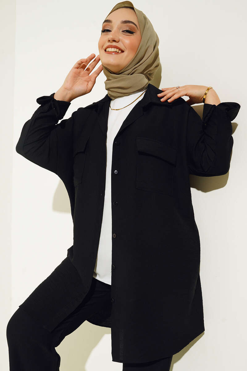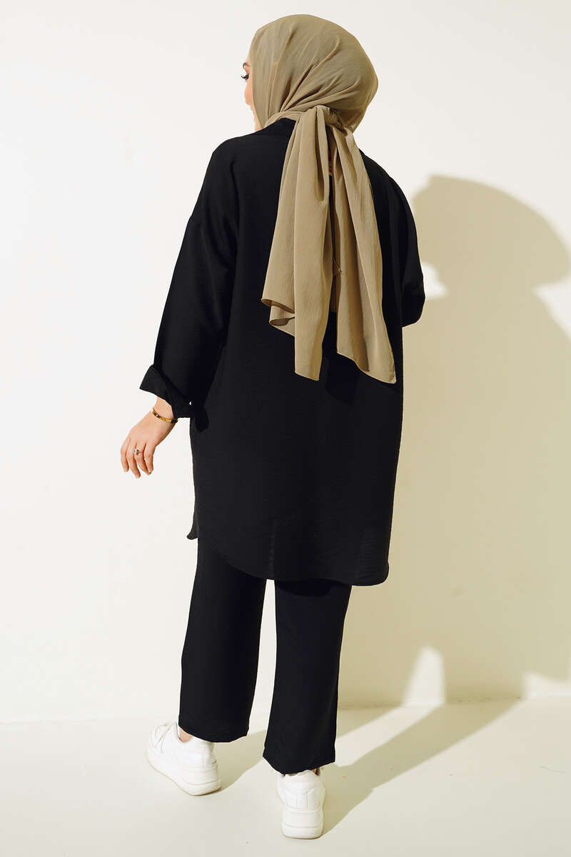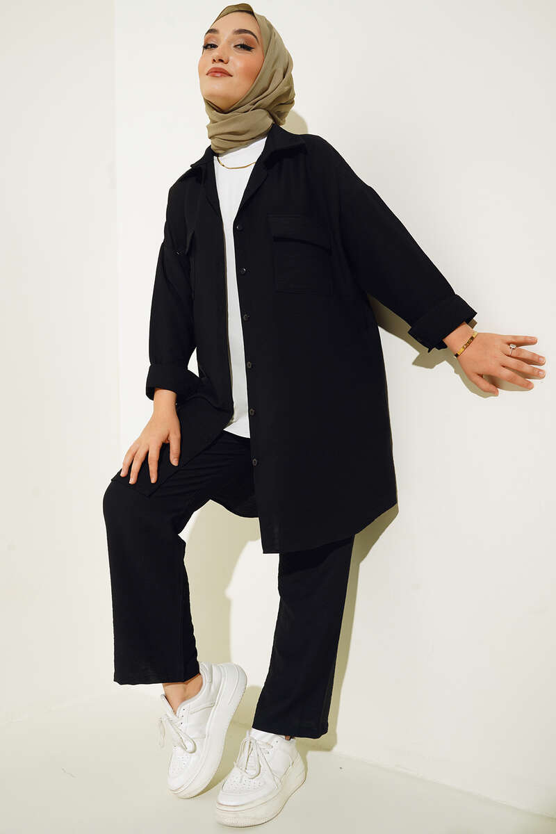 Yeni sezon ayrobin ikili takımımız tunik ve pantolondan oluşmaktadır.  Ön kısmı düğmeli olan takımımız iki adet cebe sahiptir. Tuniğimiz uzun yapısıyla hem rahat hem şık bir modeldir. Renk seçenekleri bulunmaktadır.