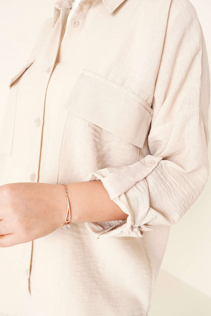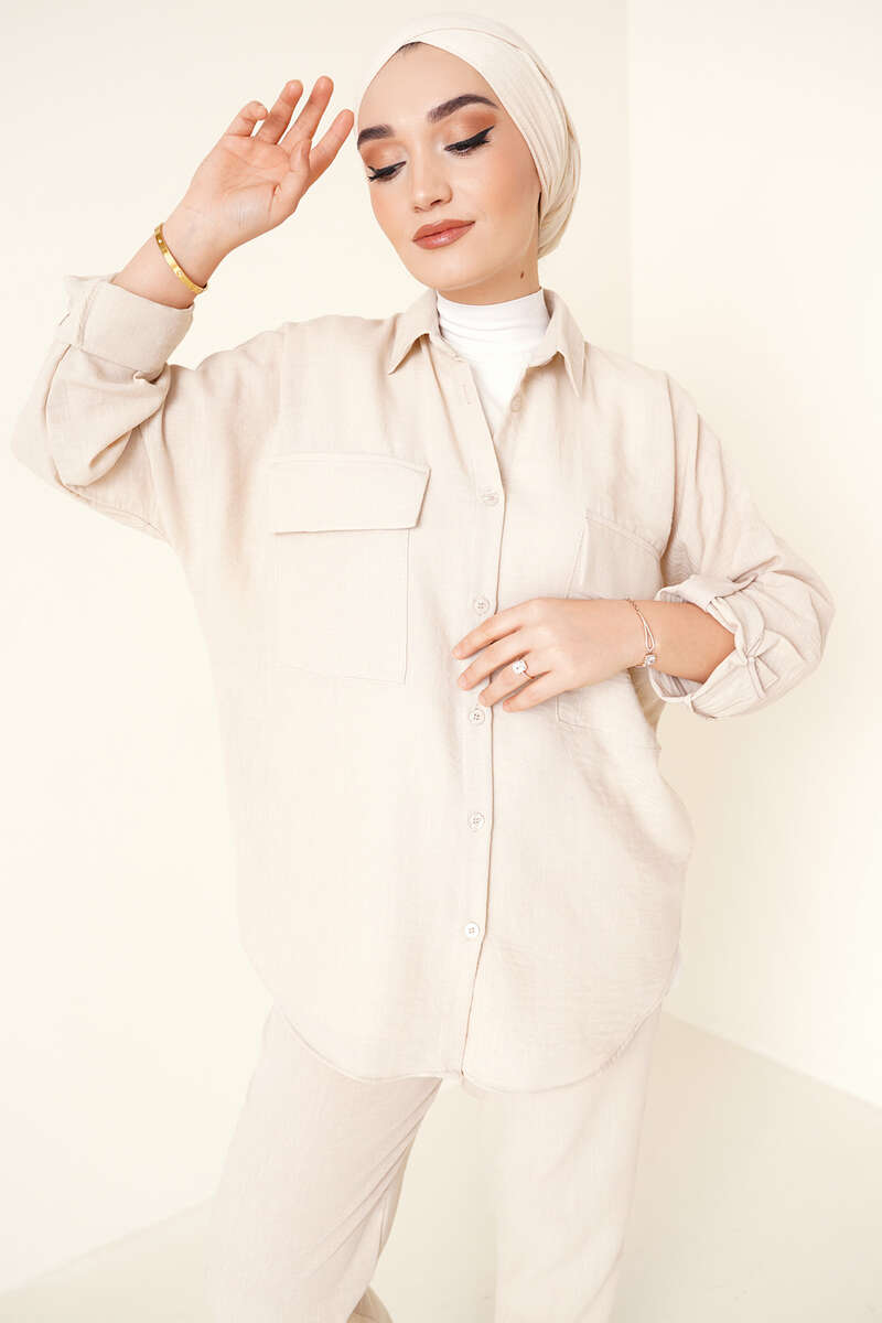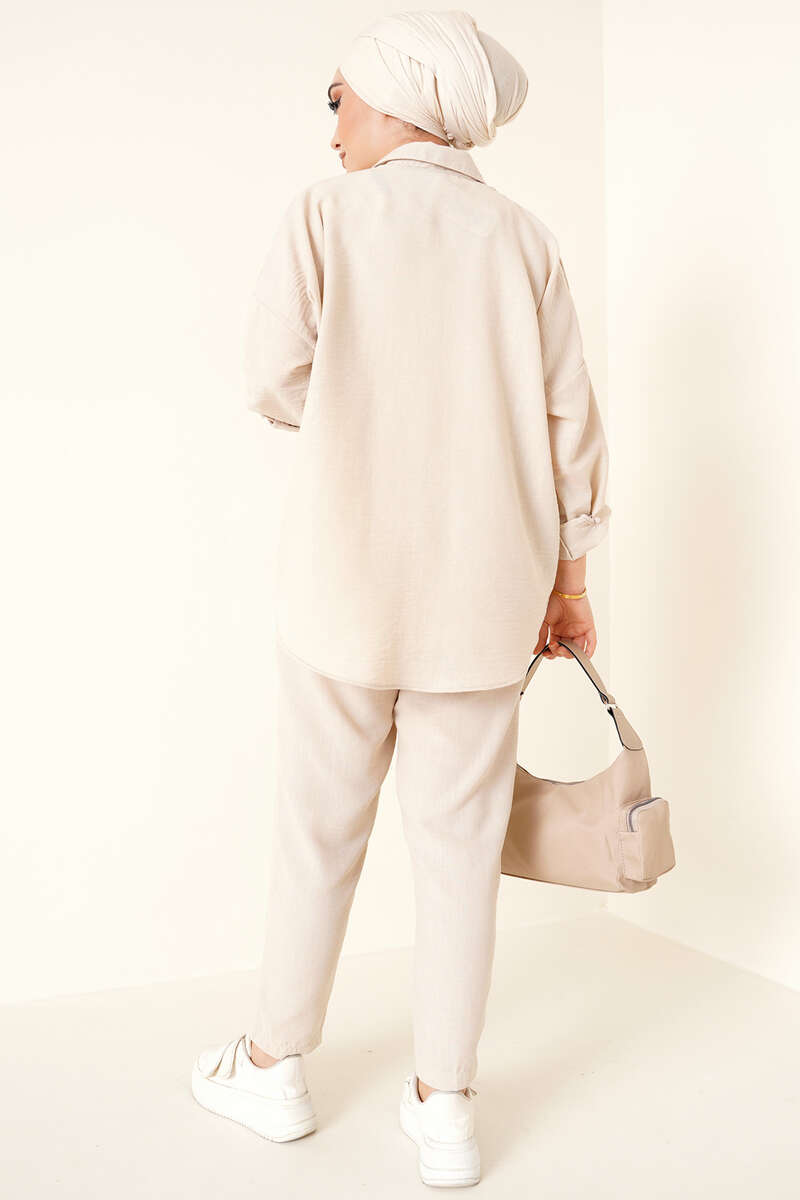 Yeni sezon keten ikili takımımız sportif ve rahat yapısıyla favori listenizin en başında olacak. İkili takımımızın tuniği iki adet göğüs cebe sahiptir. Cepleri kapaklı olan tuniğimiz düşük omuz modeldir. Kolları katlanabilmektedir. İkili takımımızn pantolonu ceplidir. Beli lastiklli olan pantolonumuzbol paçadır.