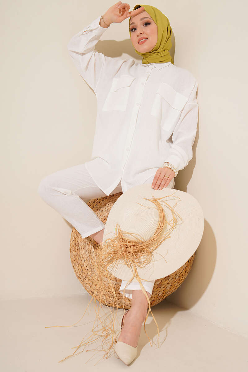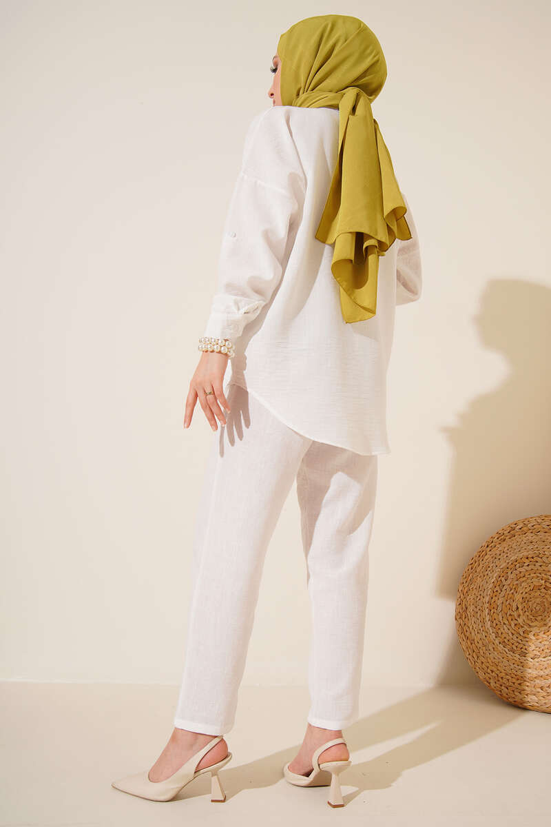 Yeni sezon keten ikili takımımız sportif ve rahat yapısıyla favori listenizin en başında olacak. İkili takımımızın tuniği iki adet göğüs cebe sahiptir. Cepleri kapaklı olan tuniğimiz düşük omuz modeldir. Kolları katlanabilmektedir. İkili takımımızn pantolonu ceplidir. Beli lastiklli olan pantolonumuz bol paçadır.