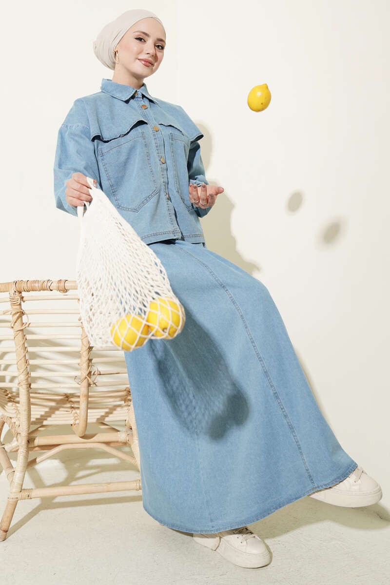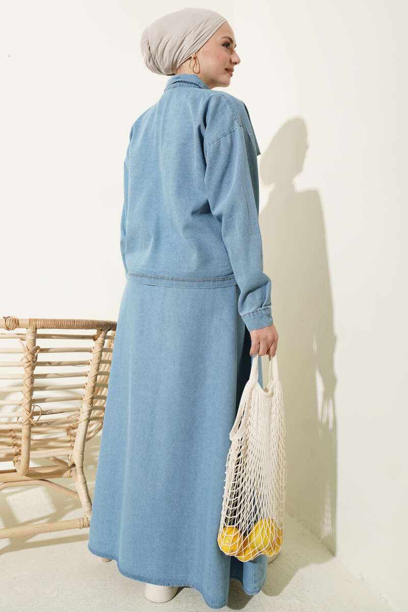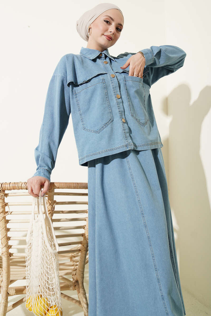 Çift Cepli Kot Ceketli Etekli İkili Takım Açık Mavi
