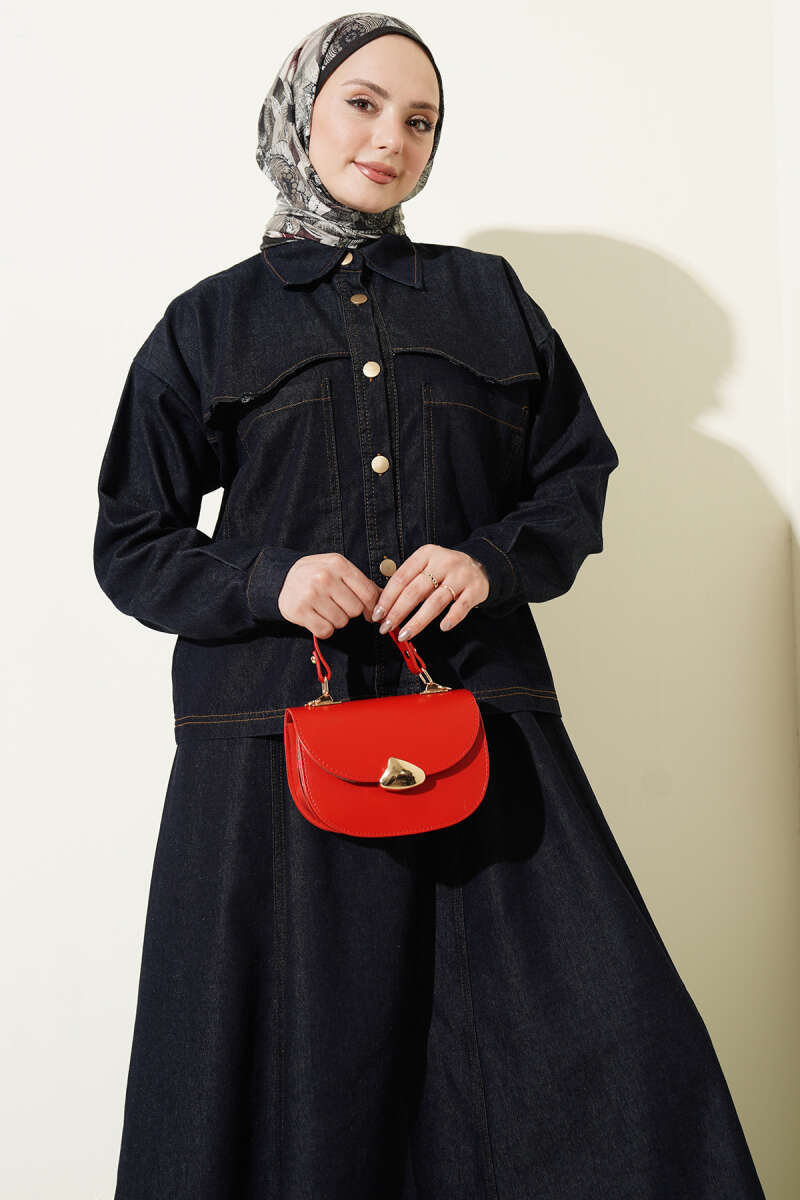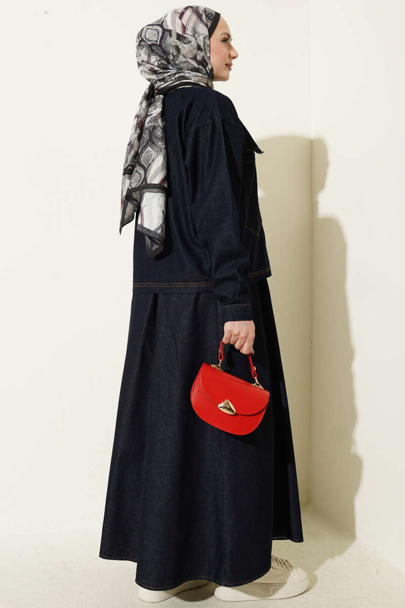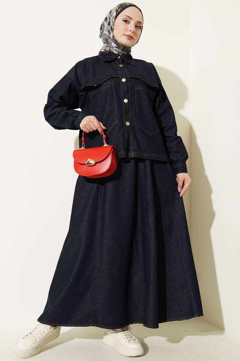 Denim dokusunun zamansız şıklığını modern bir formla buluşturan bu ikili takım, hem günlük hem de spor-şık kombinleriniz için ideal bir konfor sunar. Çift göğüs cebi ve belirgin dikiş detaylarıyla hareket kazanan ceket, dökümlü ve uzun etek kesimiyle dengeli bir silüet oluşturur. Kaliteli kumaş yapısı sayesinde gün boyu hareket özgürlüğü sağlarken, fonksiyonelliği ve stil sahibi duruşu bir arada vadeder. Gardırobunuzun en kurtarıcı setlerinden biri olmaya aday olan bu tasarım, çabasız zarafeti her mevsim üzerinizde taşımanıza olanak tanır.