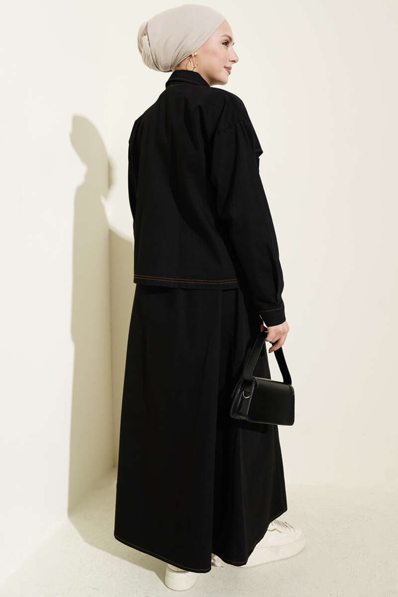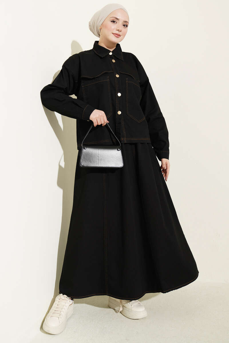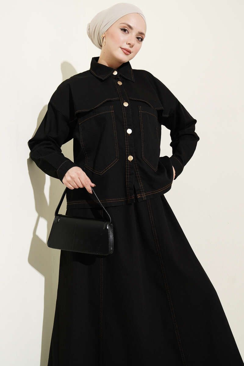 Çift Cepli Kot Ceketli Etekli İkili Takım Siyah
