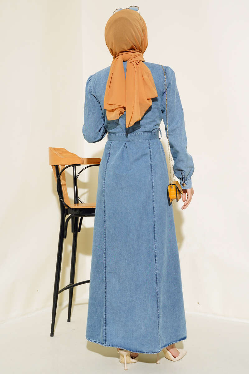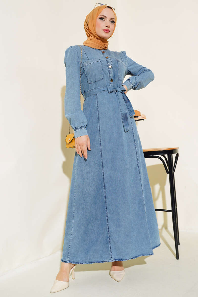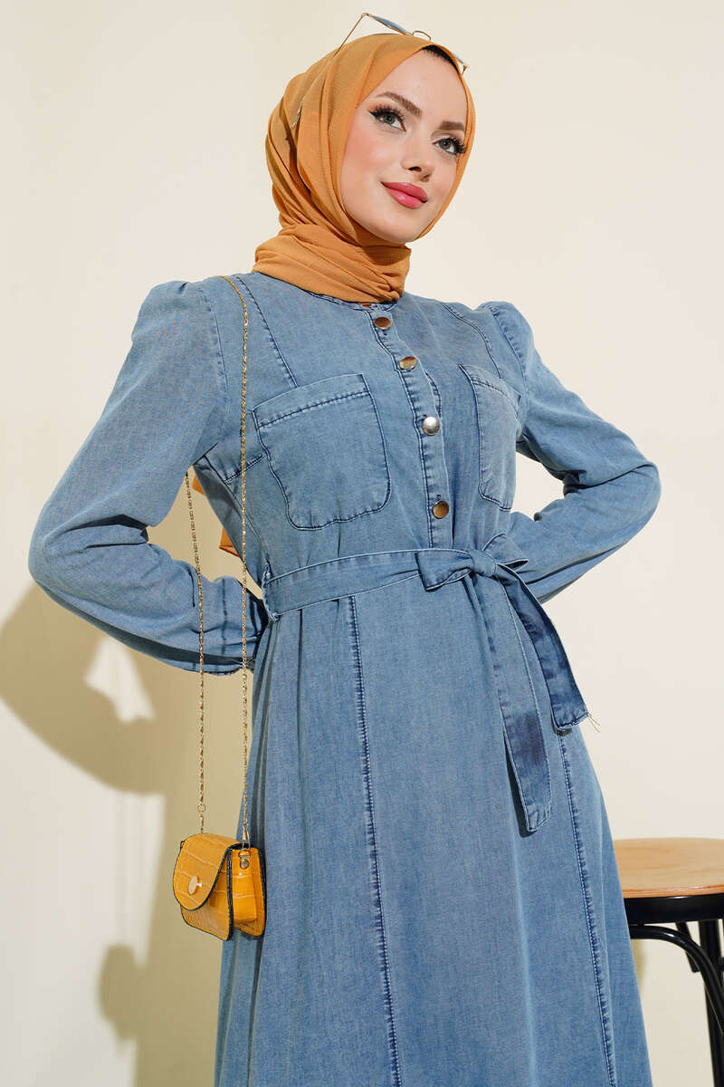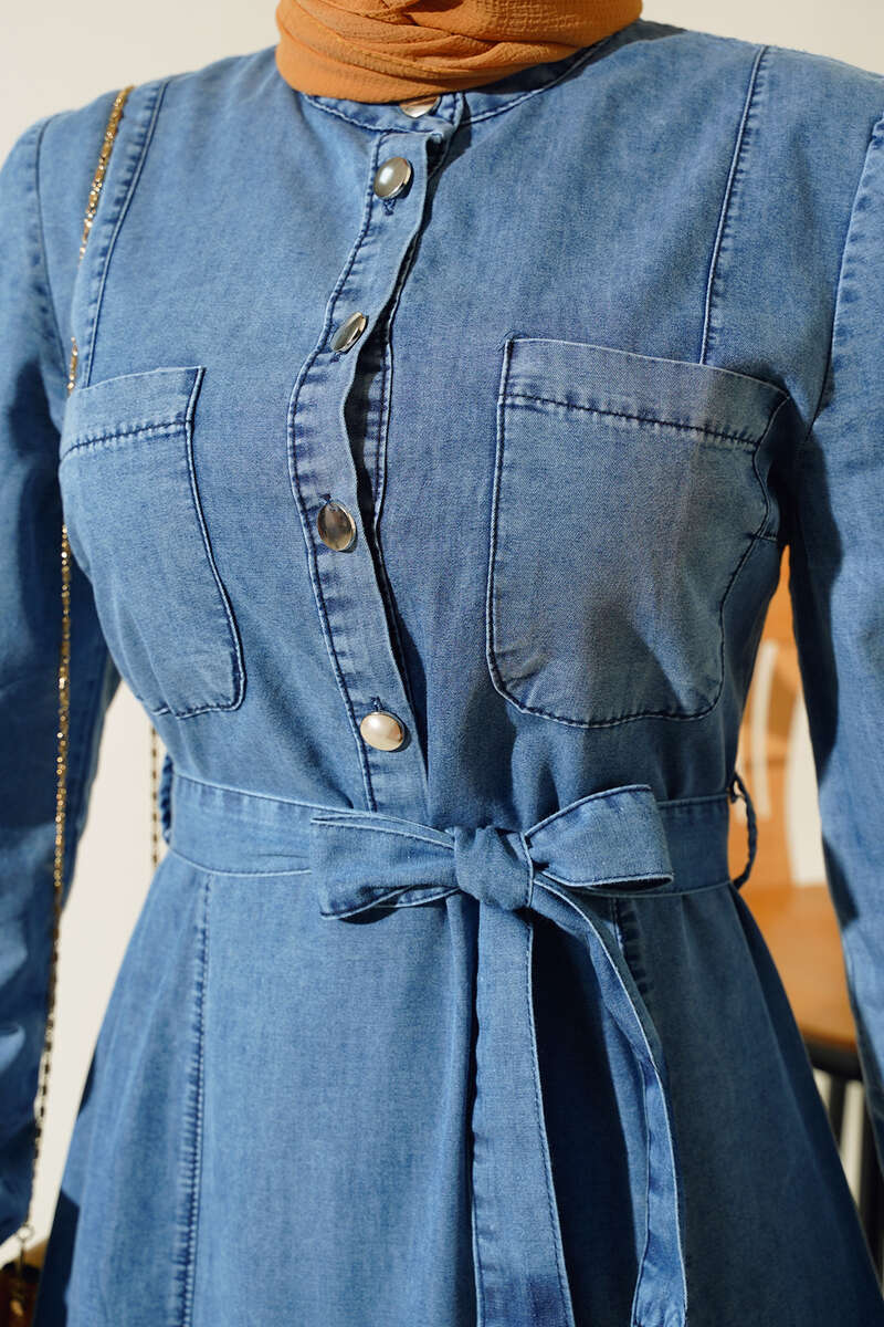 Yeni sezon kot elbisemizi çok seveceksiniz. Belden kuşak bağlamalı elbisemizin iki adet kemer köprüsü bulunmaktadır. İki adet göğüs cebi bulunmaktadır. Önü beline kadar metal düğmelidir. Kot elbisemiz dolaplarınızda yerlerini beklemektedir.