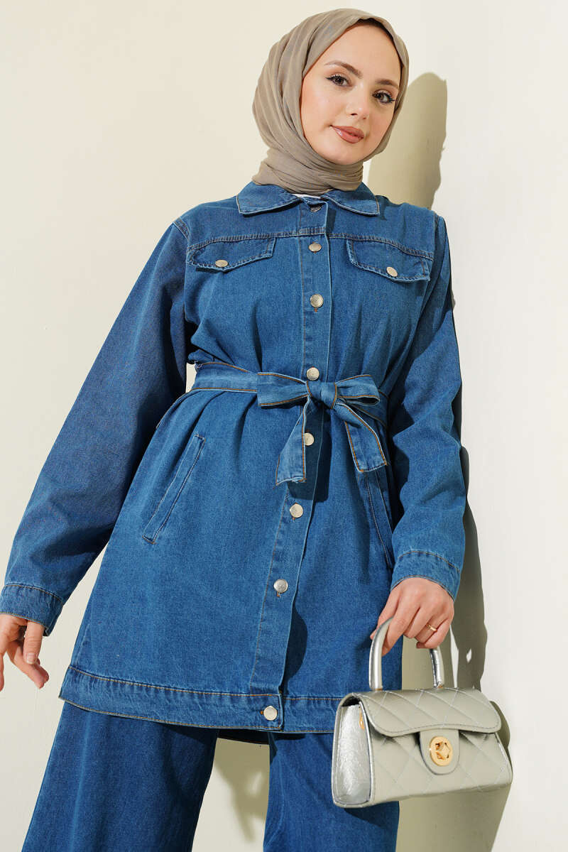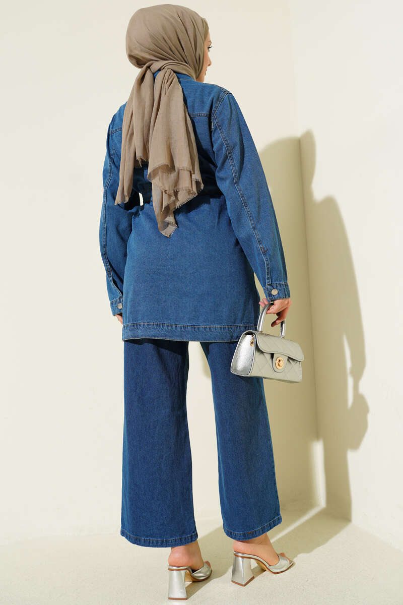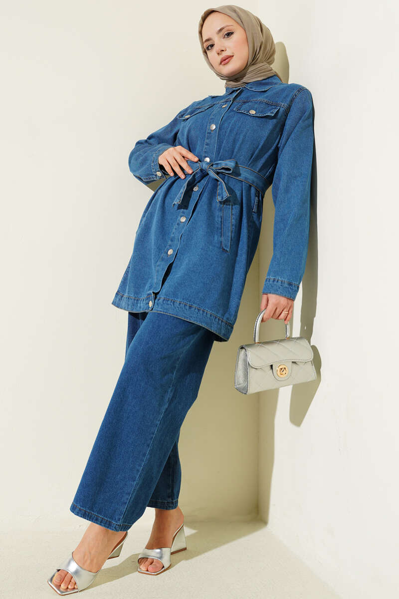 Desenli Kuşaklı Kot Etekli Takım Kot Mavisi