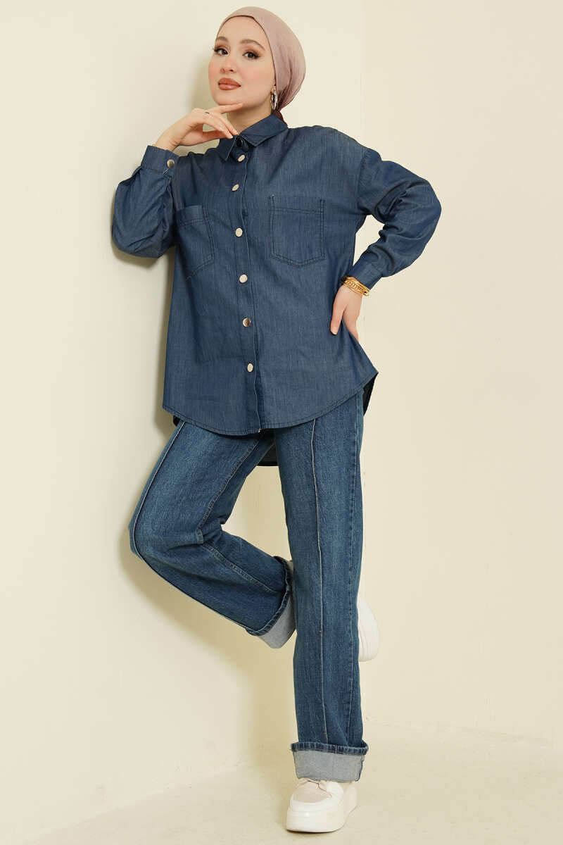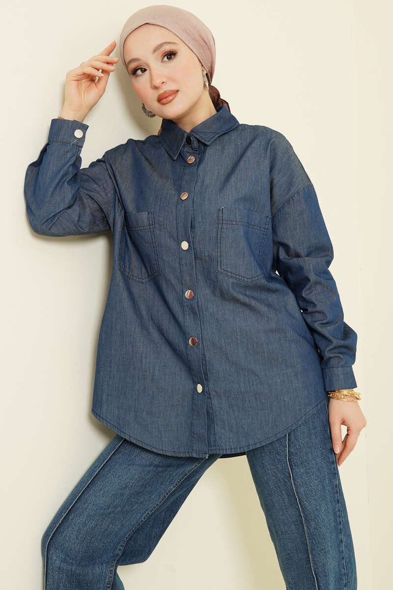 Çift Cepli Metal Düğmeli Gömlek Mavi