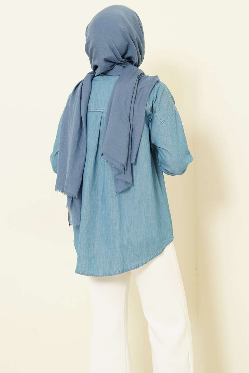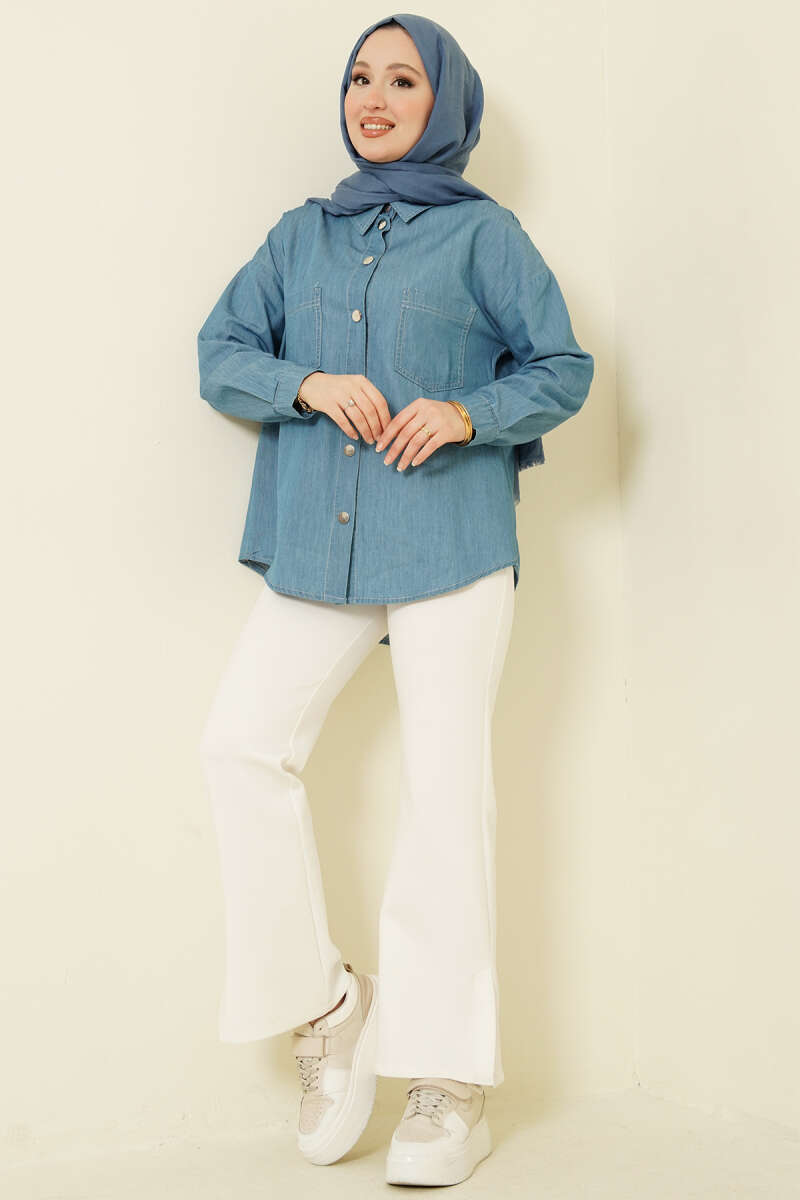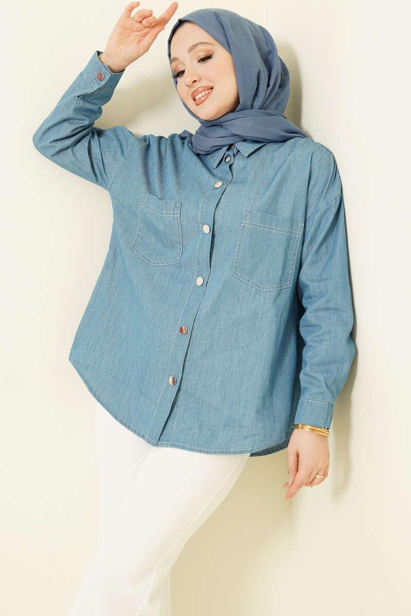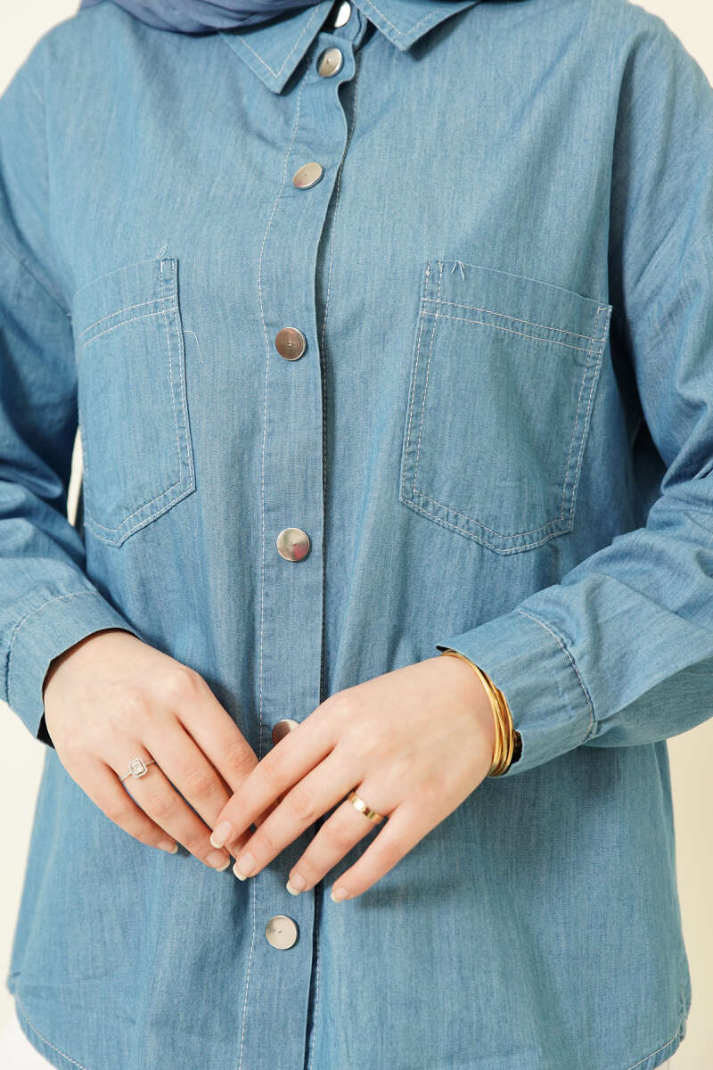 Çift Cepli Metal Düğmeli Gömlek Mavi