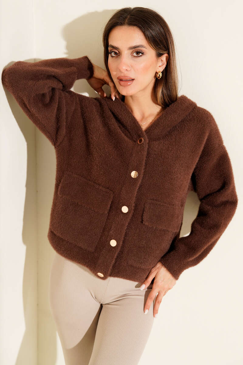 Çift Cepli Metal Düğmeli Kapüşonlu Hırka Kahve