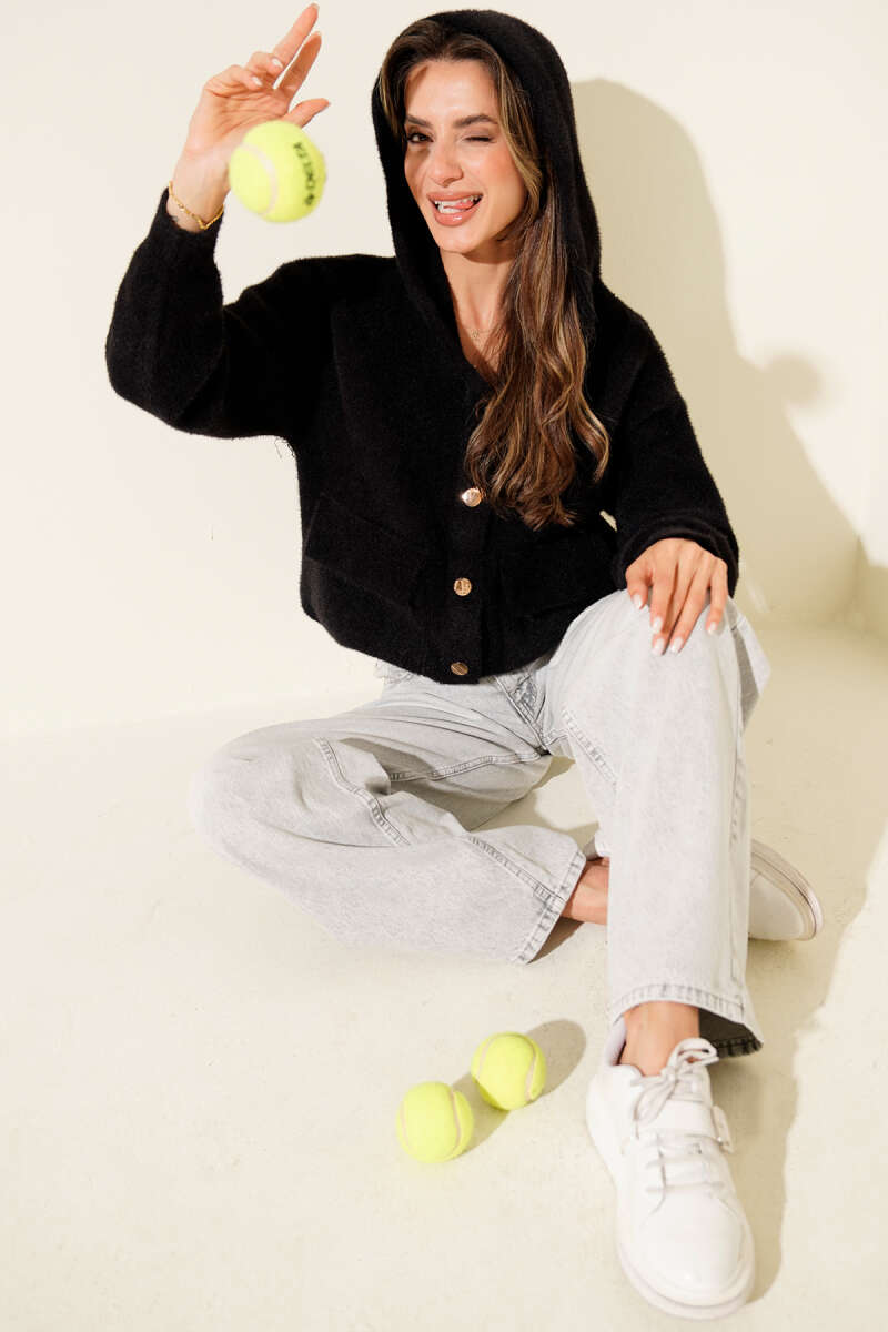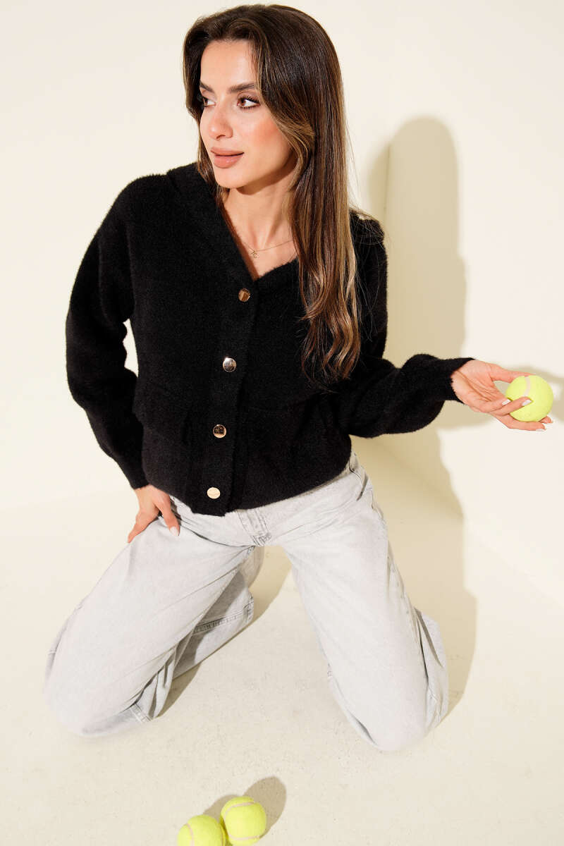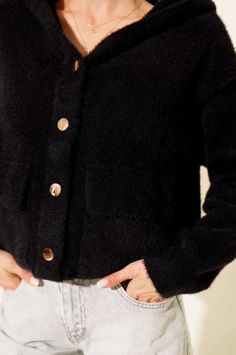 Çift Cepli Metal Düğmeli Kapüşonlu Hırka Siyah
