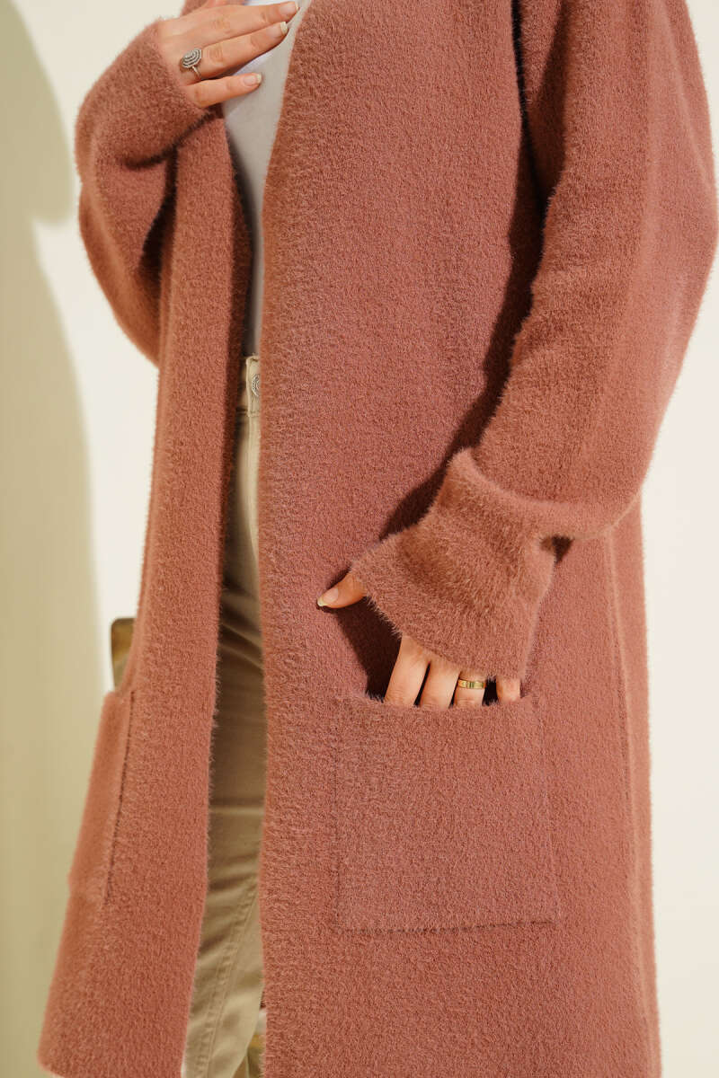 Örgü Kabartma Desenli Uzun Triko Hırka Gri