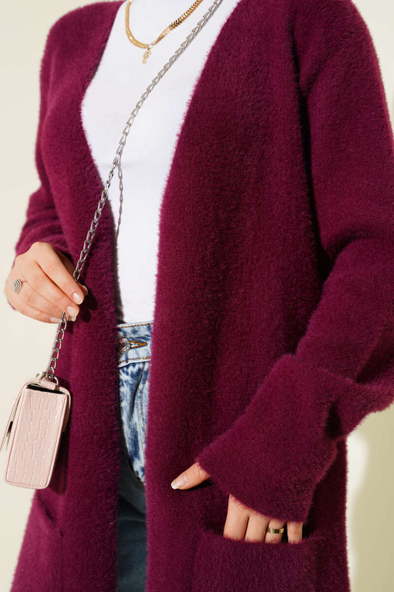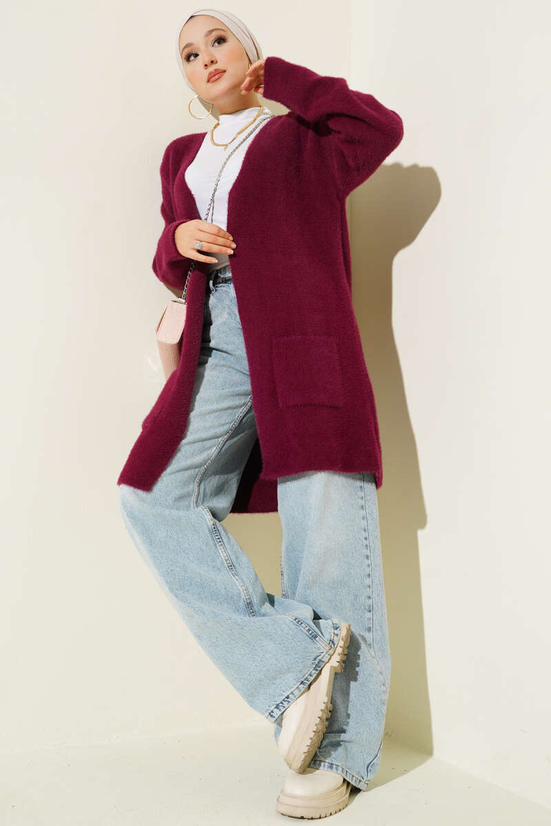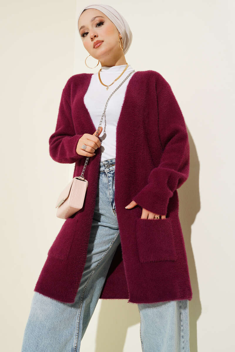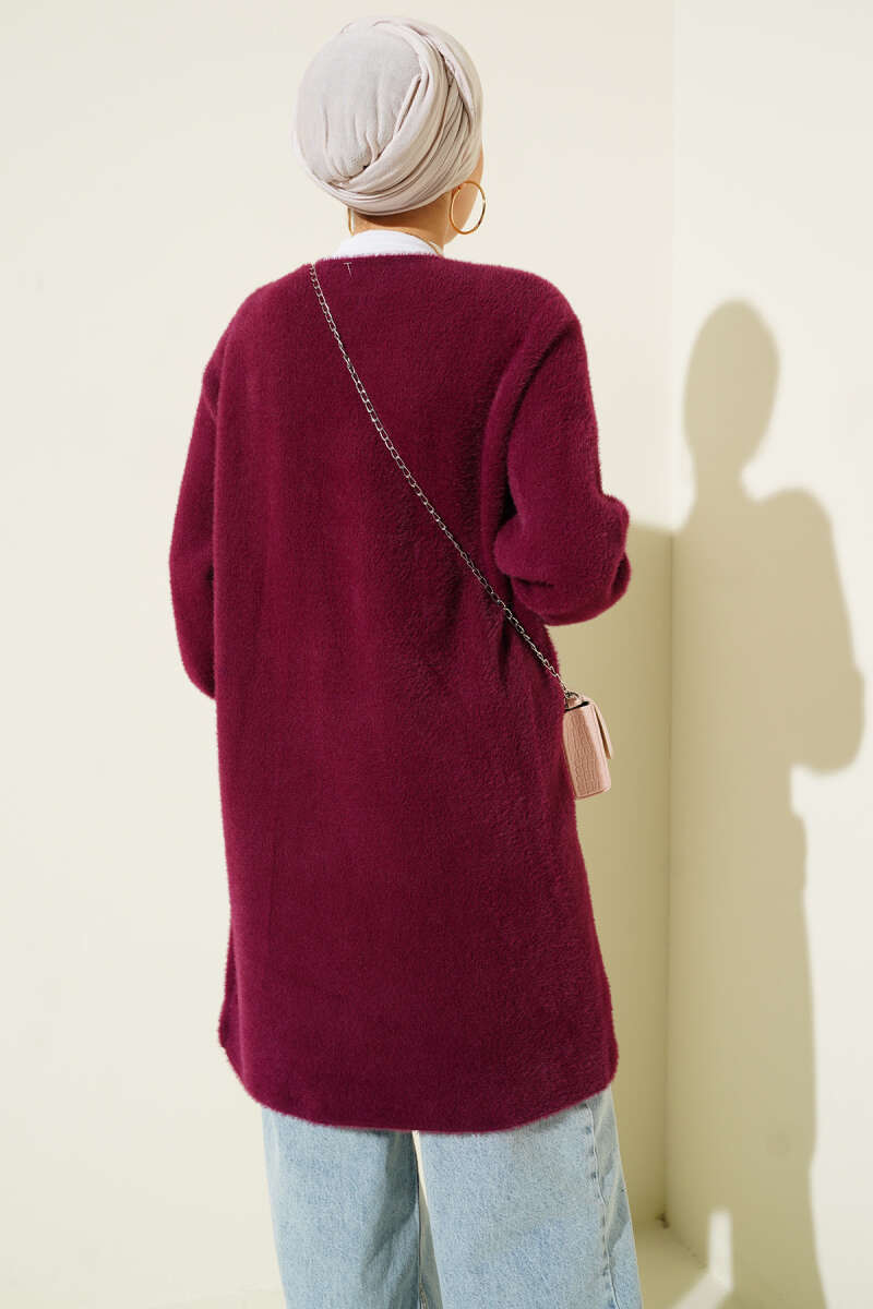 Saç Örgülü Düğmeli Triko Hırka Bordo