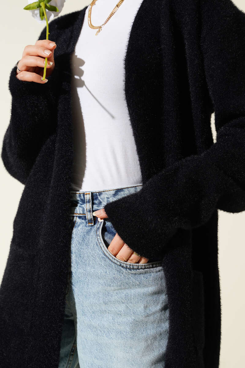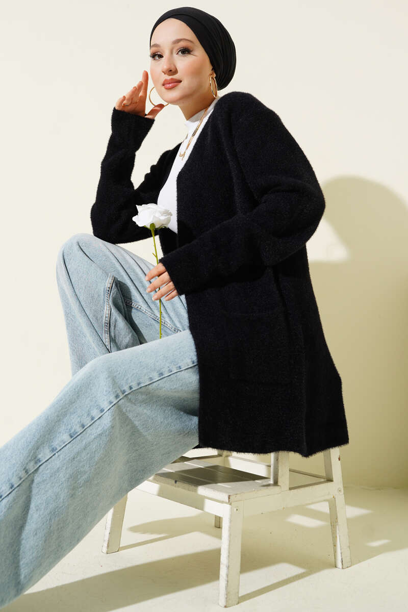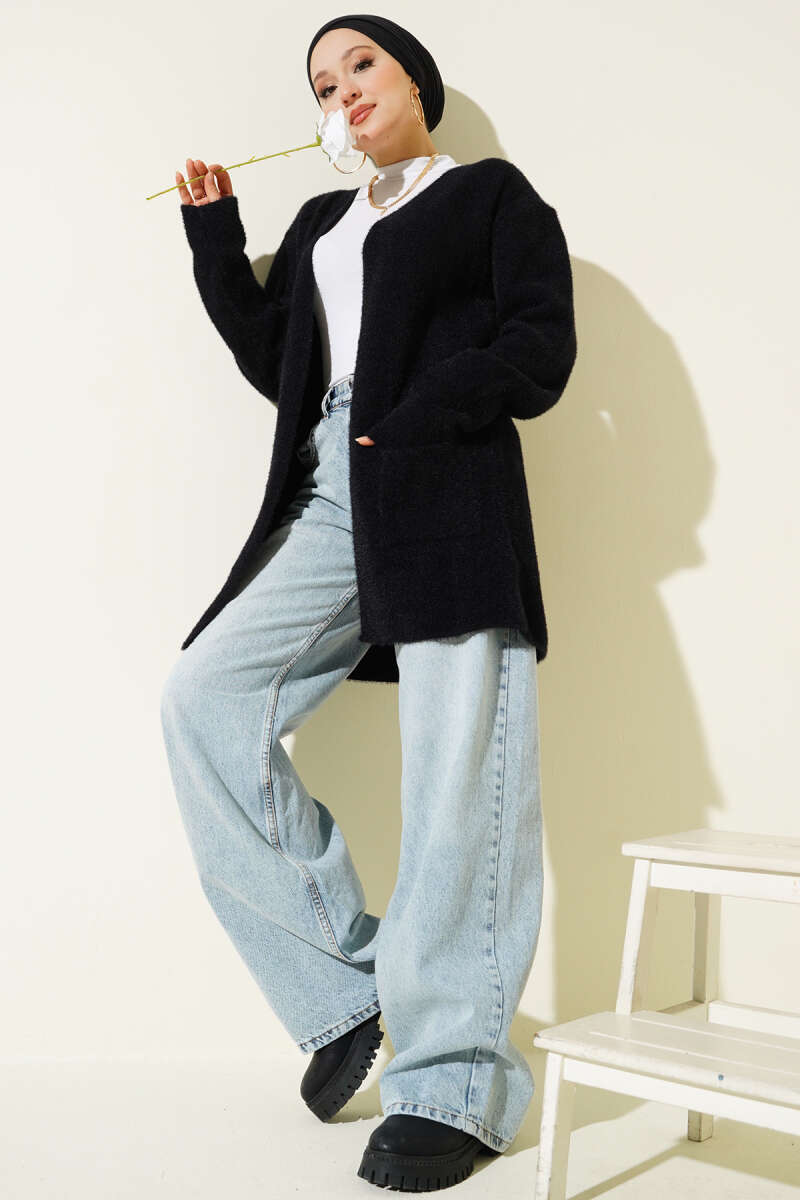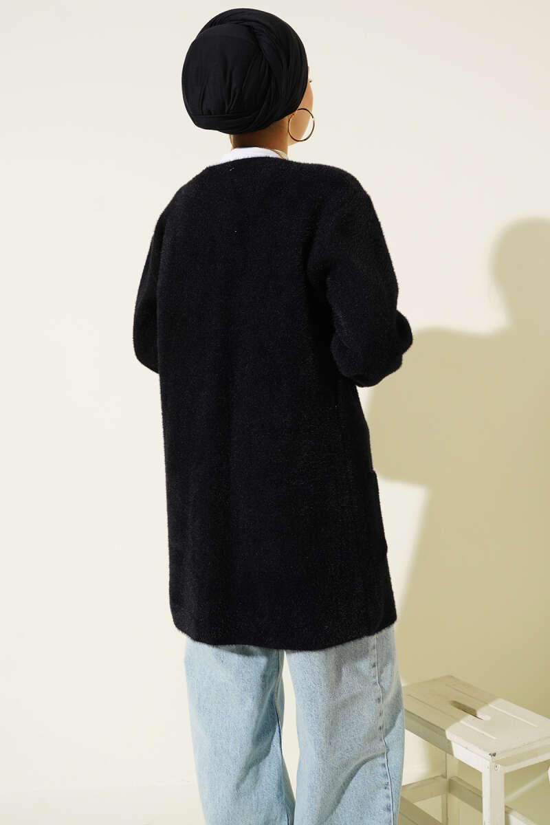 Saç Örgülü Düğmeli Triko Hırka Siyah