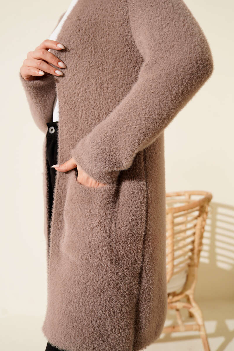 Zikzak Desenli Delikli Kuşaklı Triko Hırka Kahve