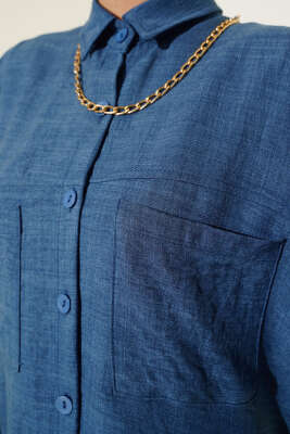 Mini Çiçekli Göğüs Cepli Kot Gömlek Koyu Mavi