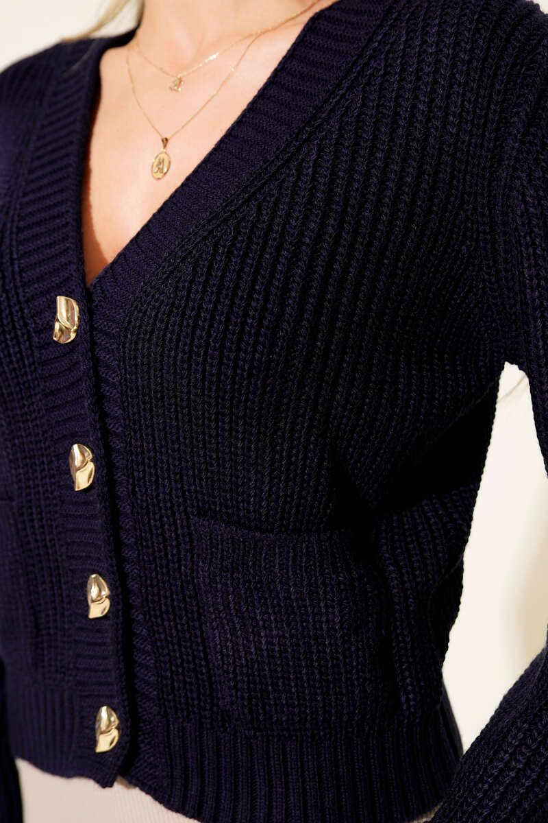 Çift Cepli Selanik Örgülü Kısa Triko Hırka Lacivert