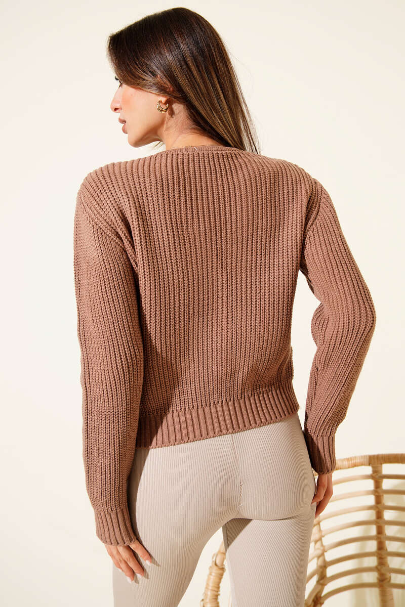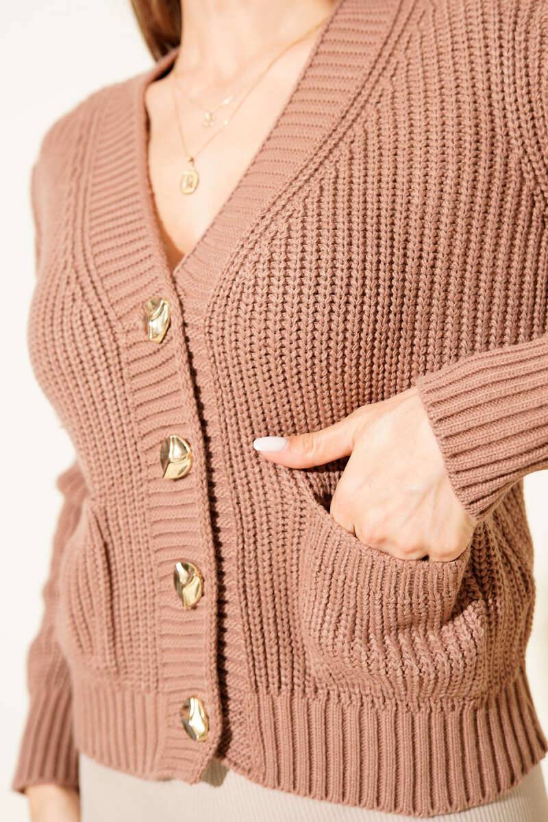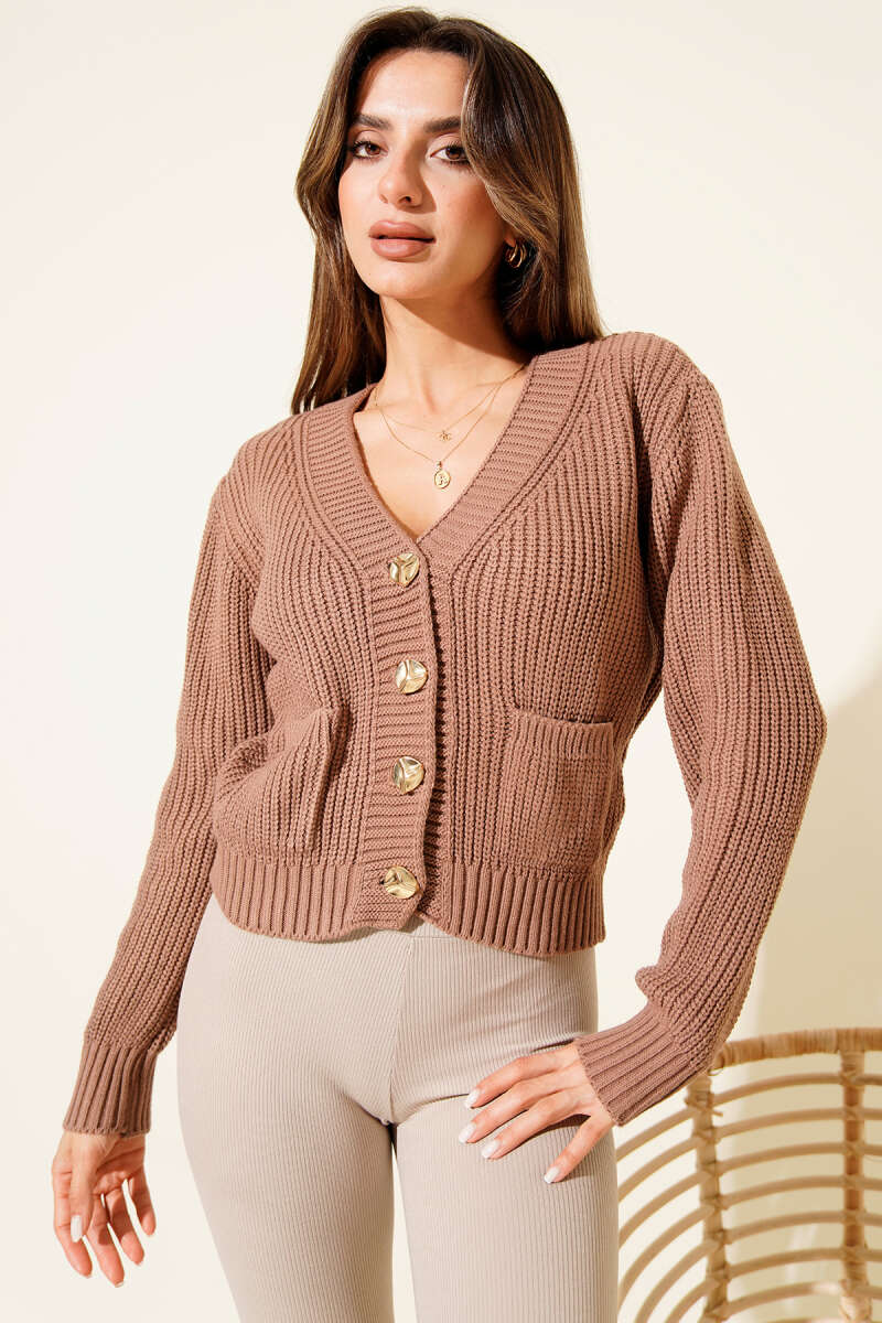 Çift Cepli Selanik Örgülü Kısa Triko Hırka Latte