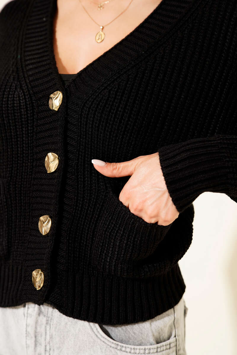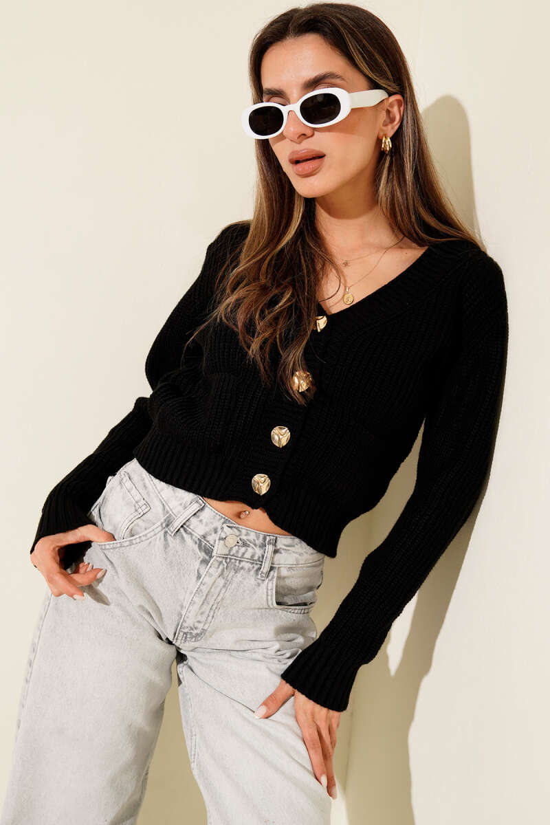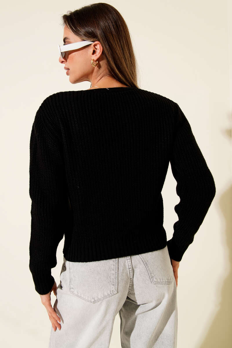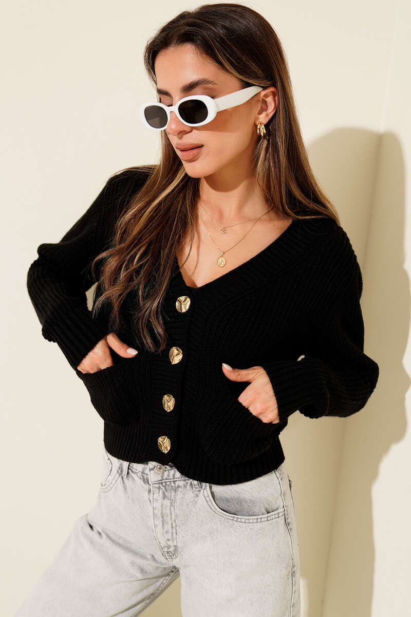 Çift Cepli Selanik Örgülü Kısa Triko Hırka Siyah