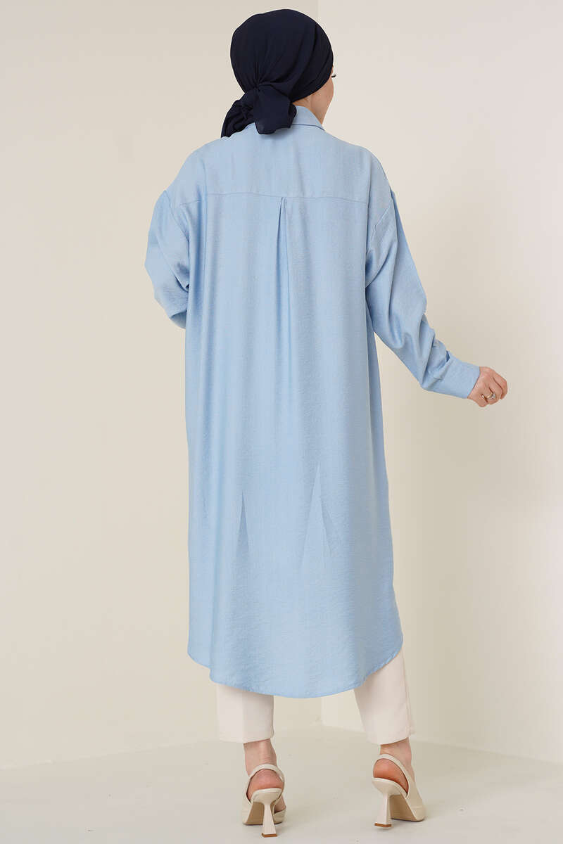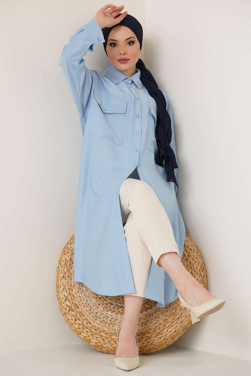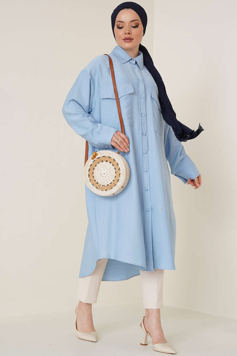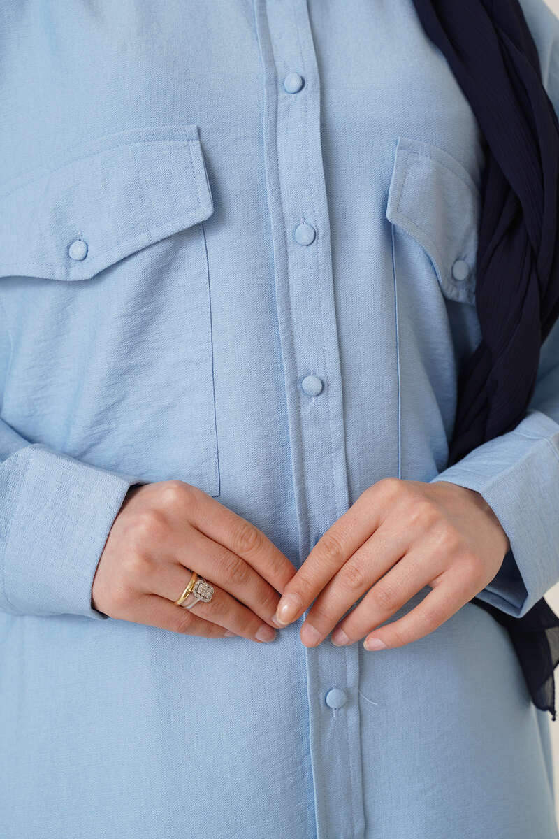 Çift Cepli Uzun Gömlek Buz Mavisi