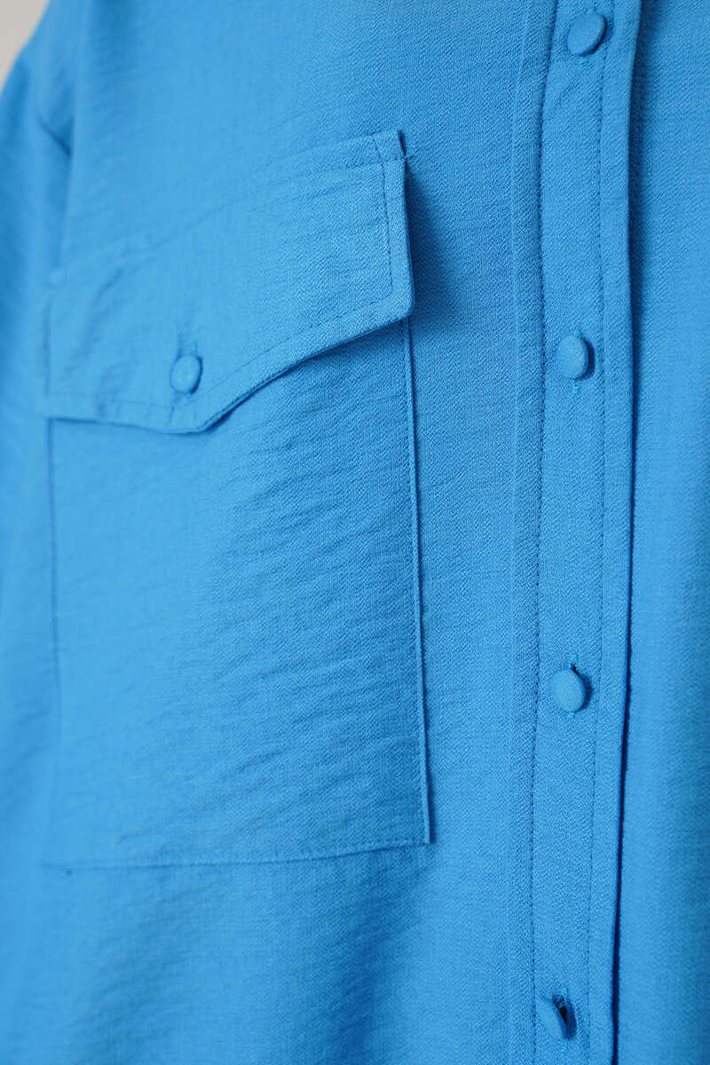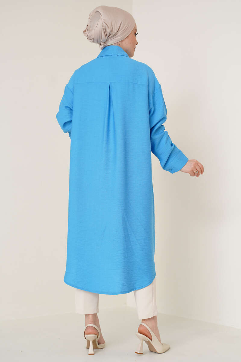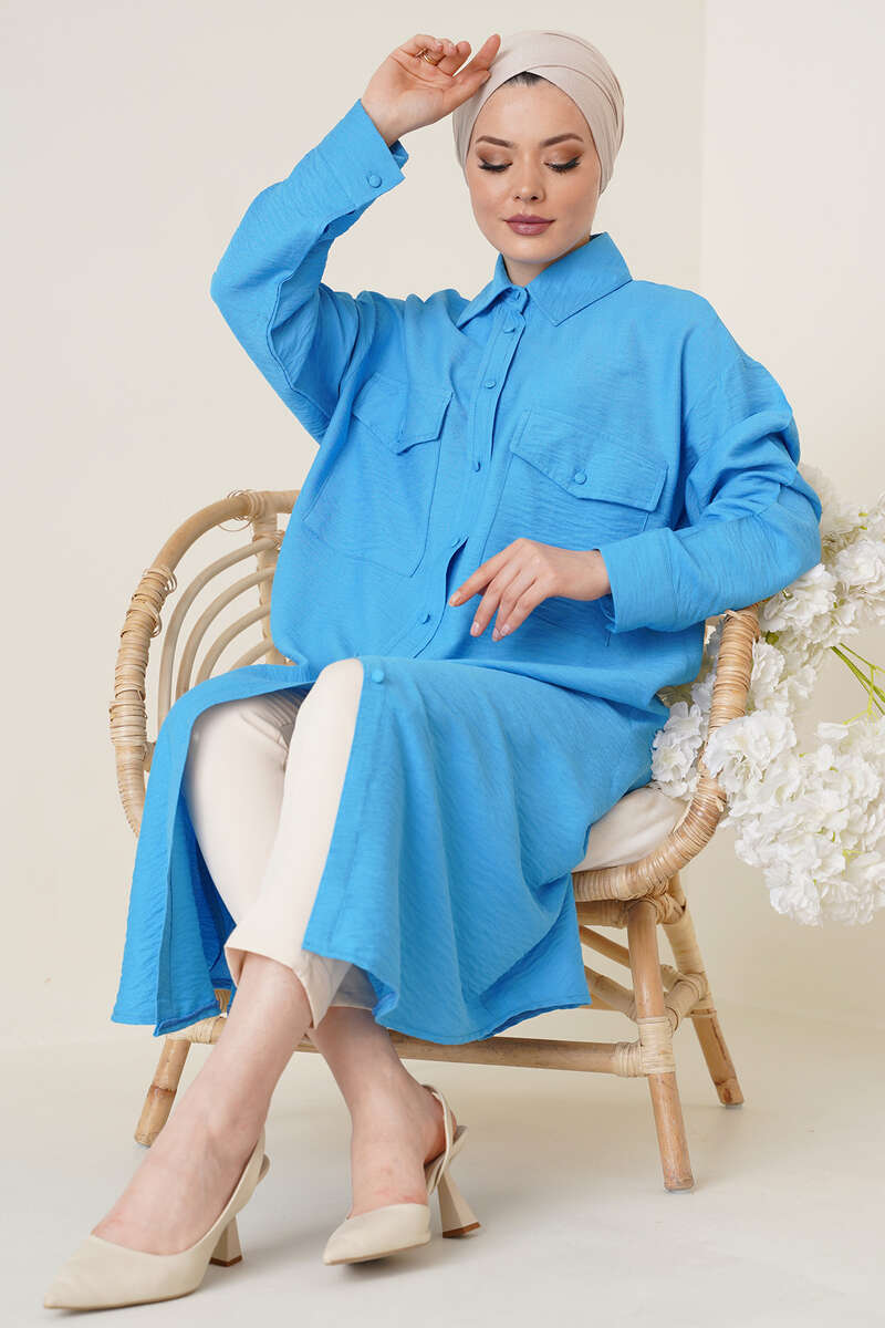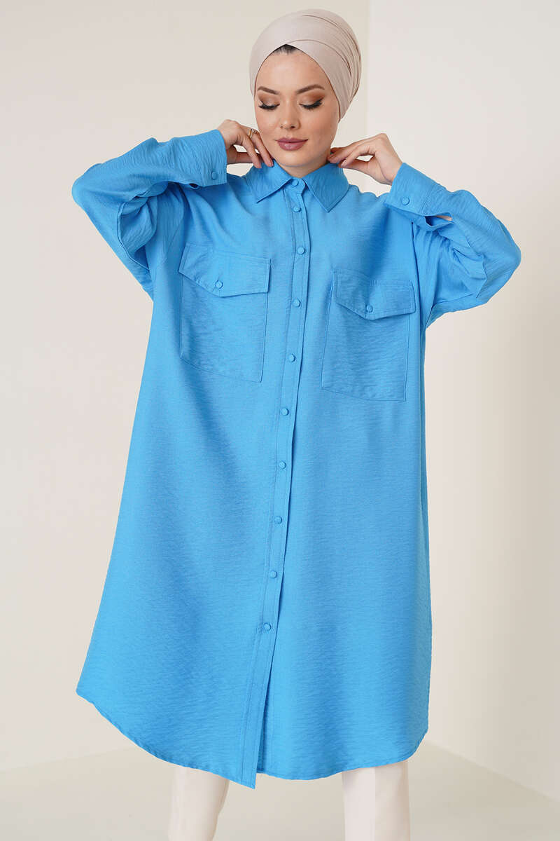 Yeni sezon uzun gömleğimiz göğsünde iki adet kapaklı cebe sahiptir. Kapakları düğmeli olan gömleğimiz düşük omuz modeldir. Kolaylıkla kombinleyebileceğiniz gömlek sezonun favorileri arasında yerini almakta.