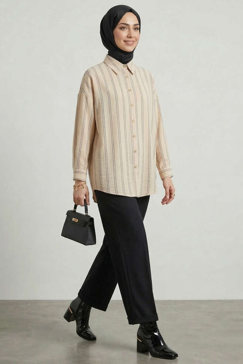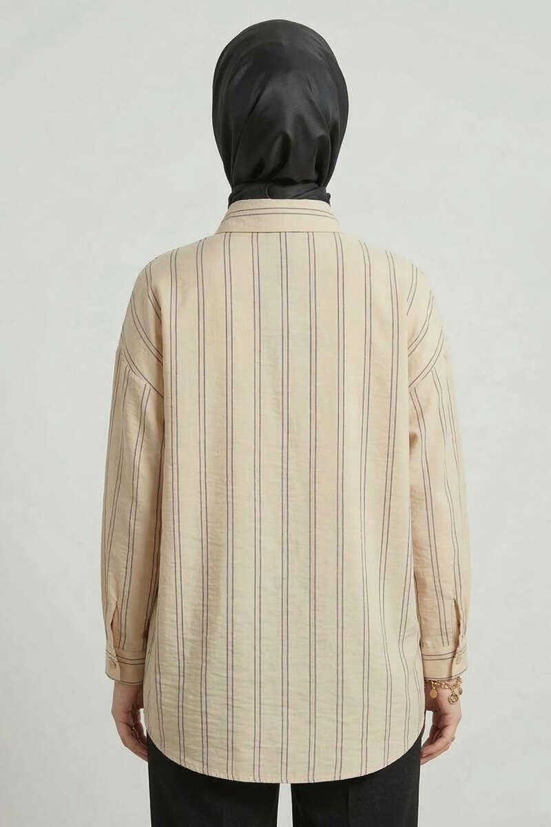 Bilek Manşetsiz İnce Çizgili Gömlek Bej