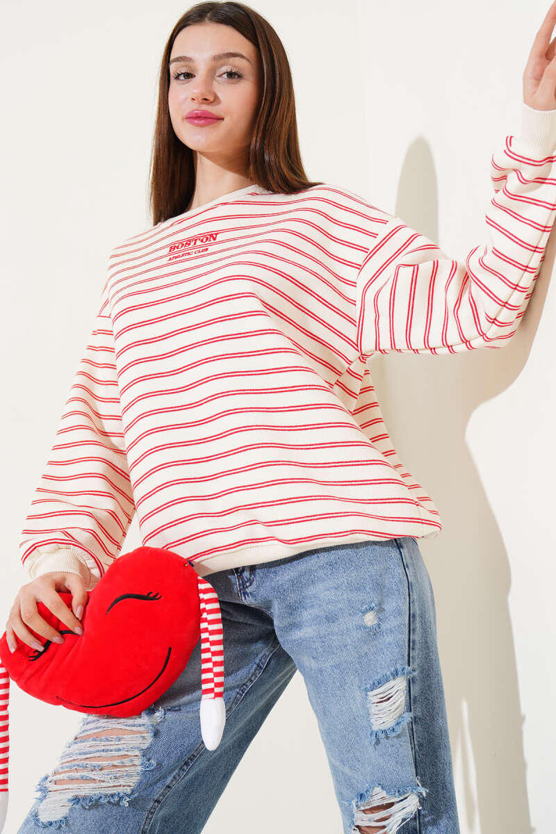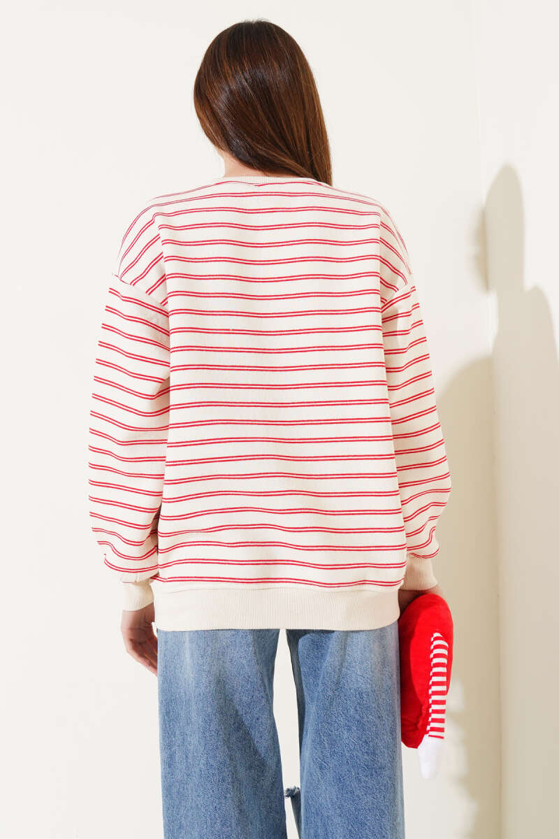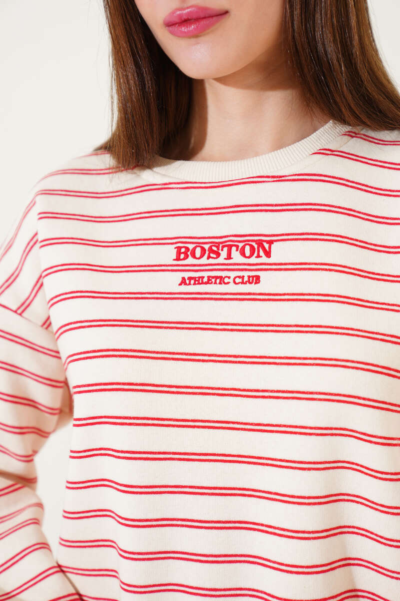 Çift Çizgili Nakışlı Sweatshirt Kırmızı