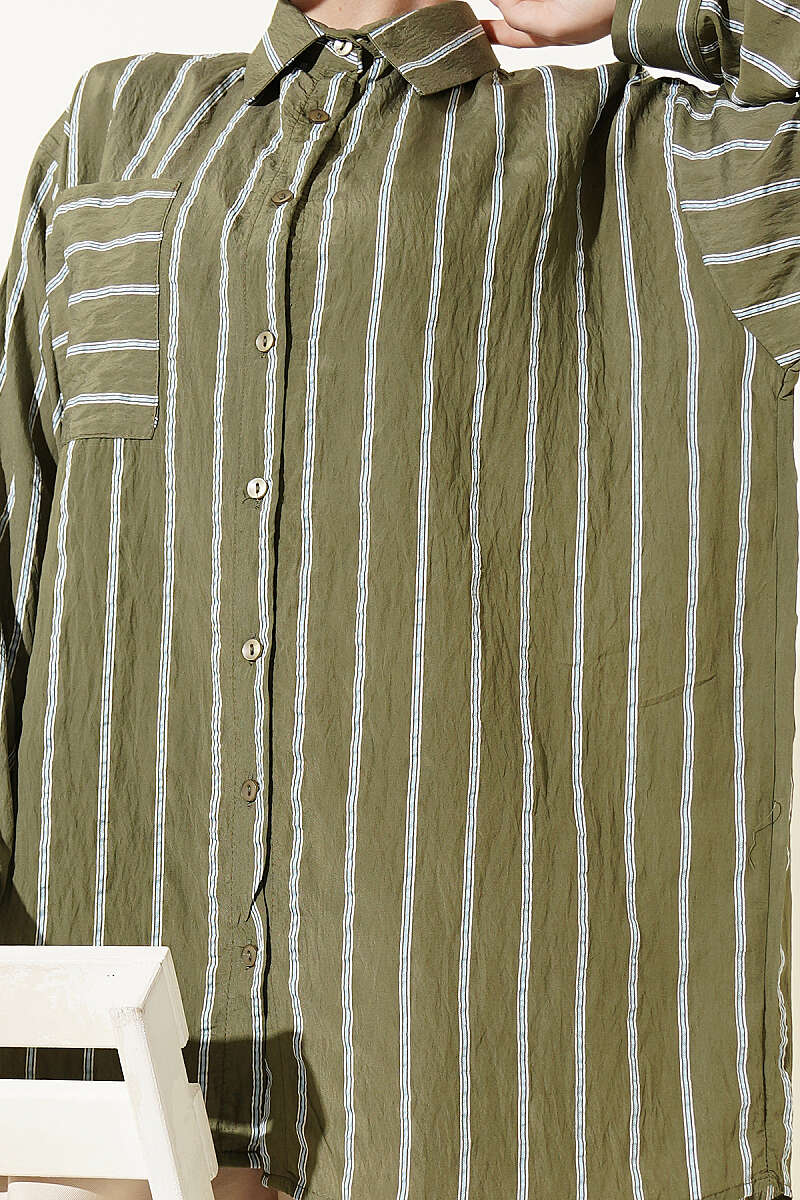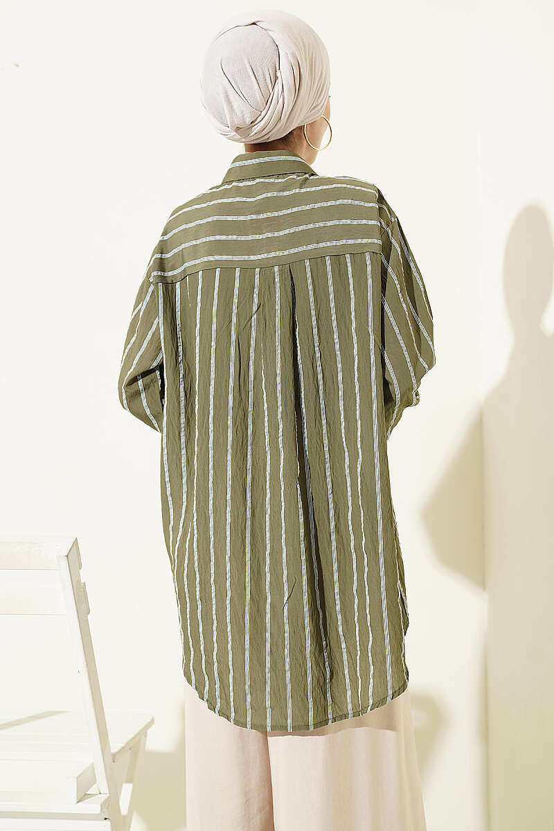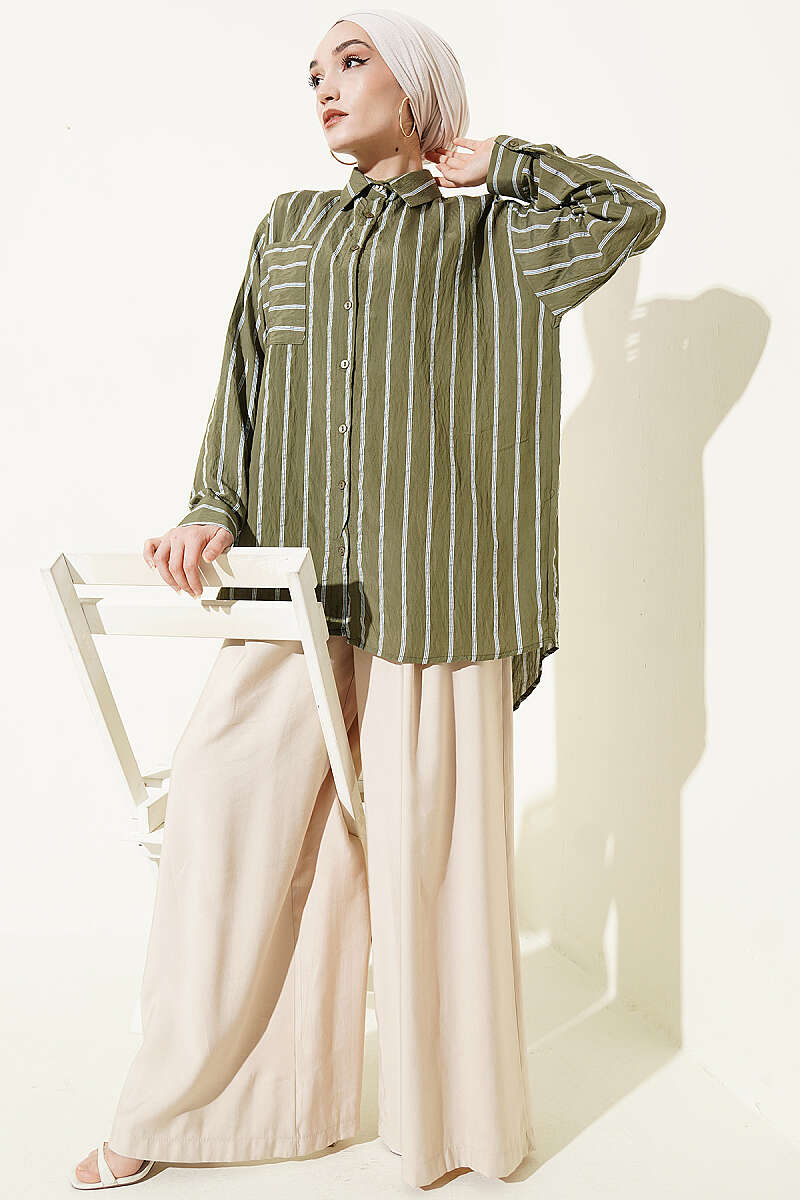 İnce Çizgili Güpür Detaylı Gömlek Saks