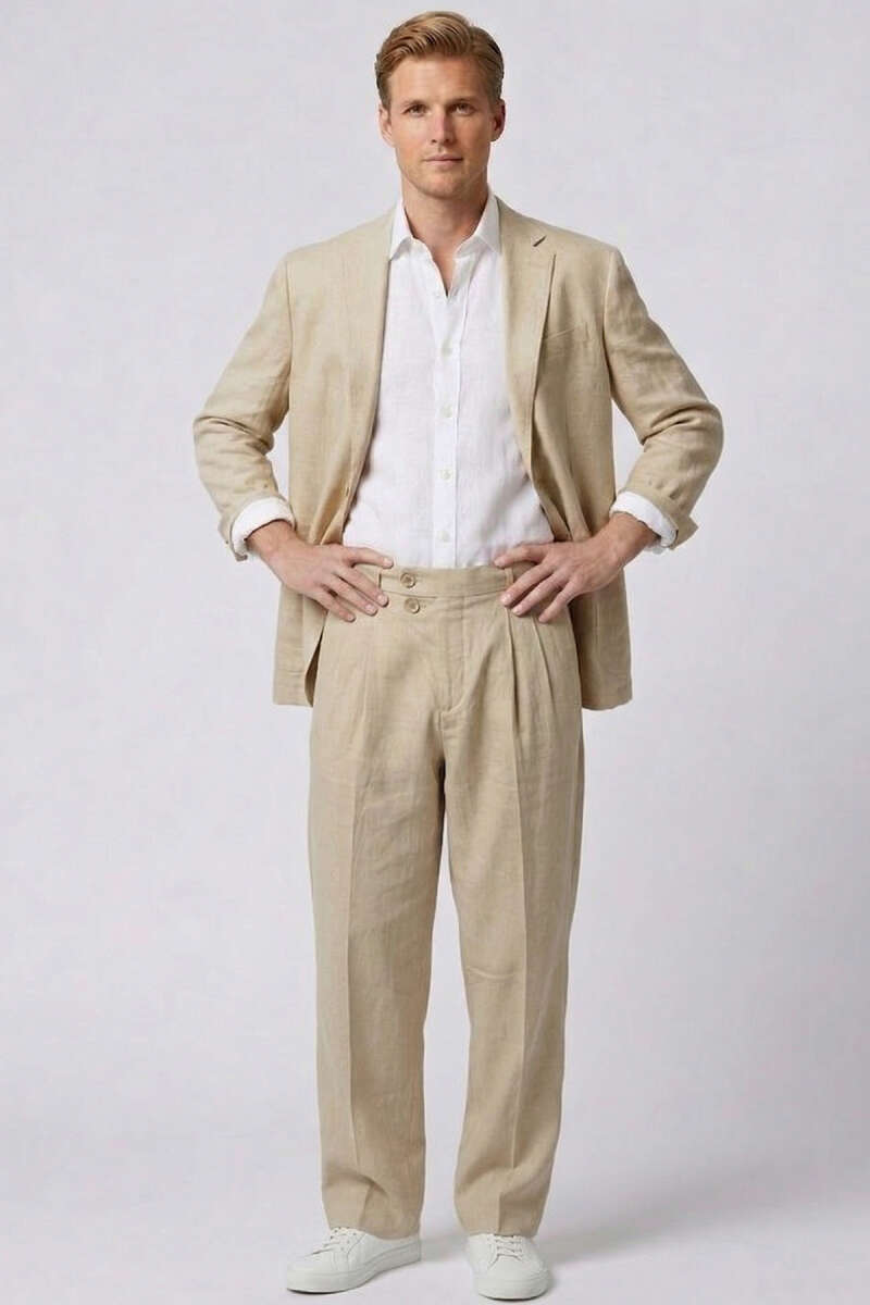 Hasır Kemerli Keten Erkek Pantolon Beyaz