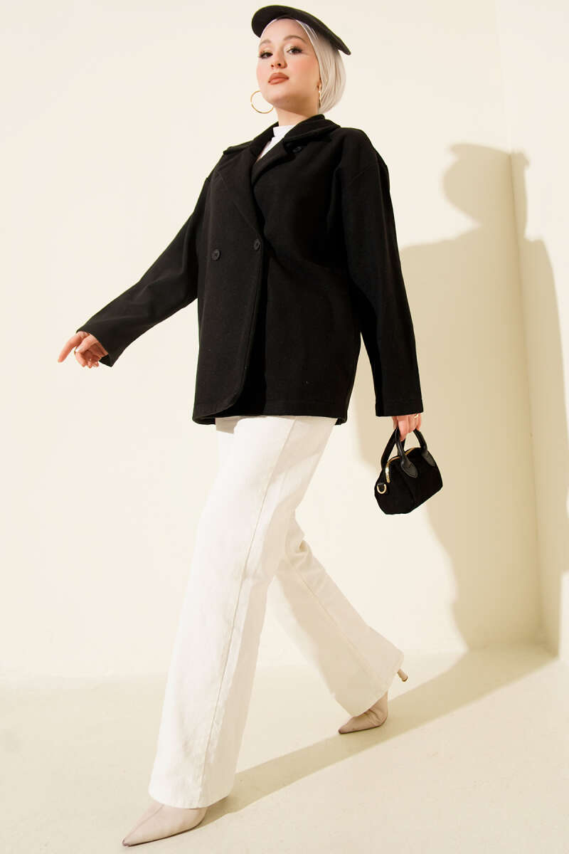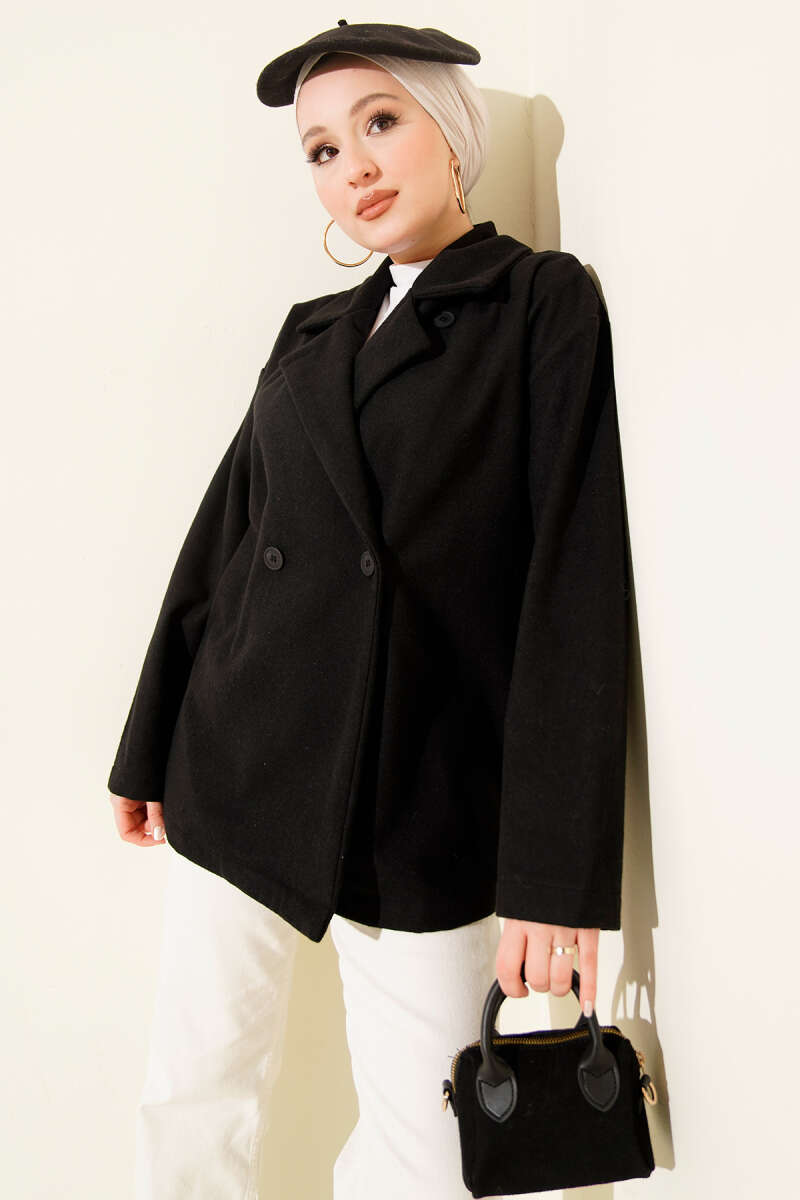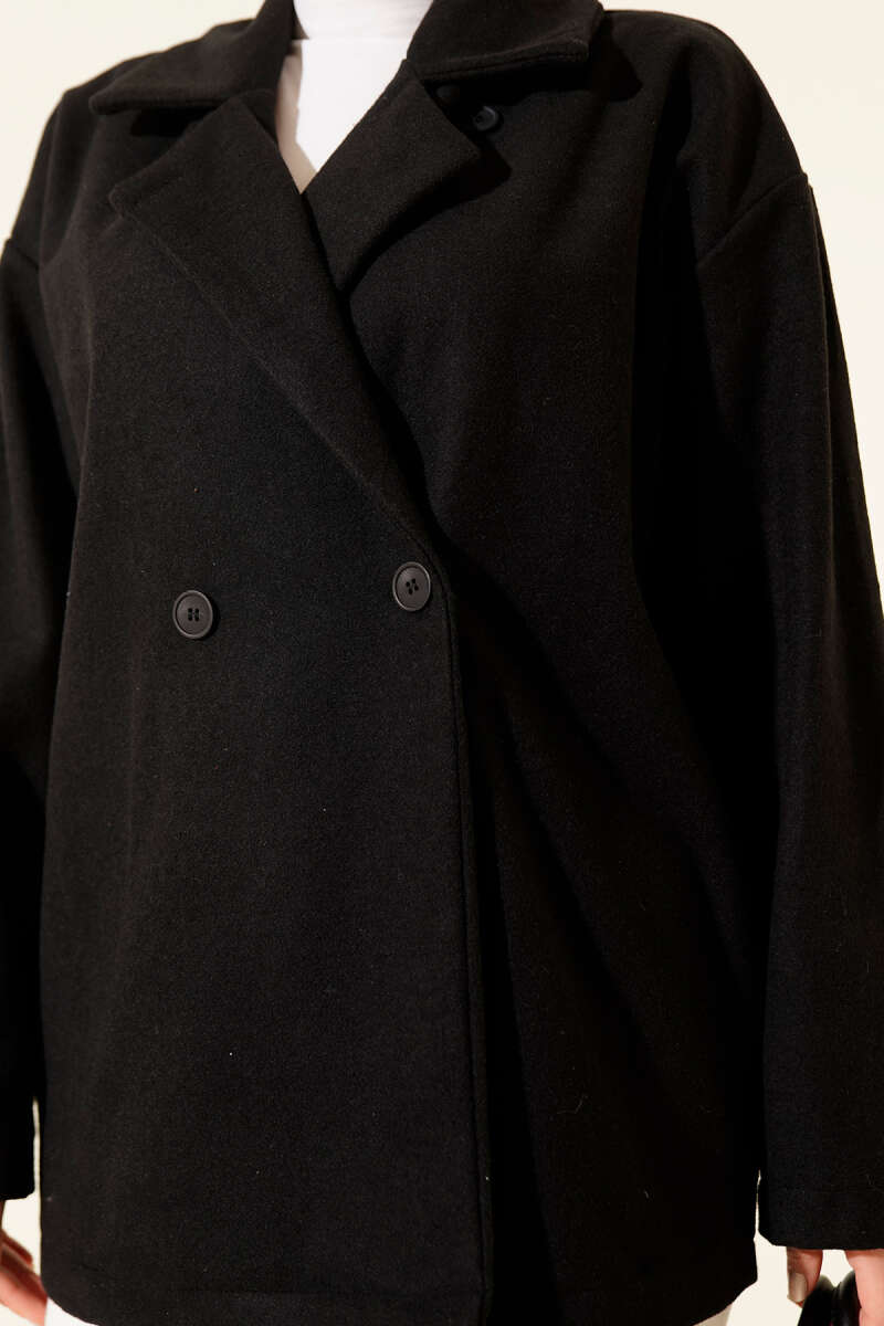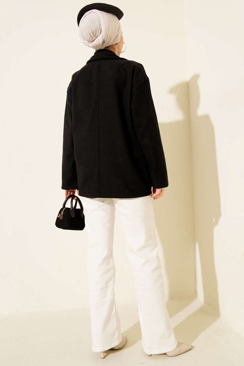 Gold Düğmeli Ribanalı Kaşe Kaban Siyah