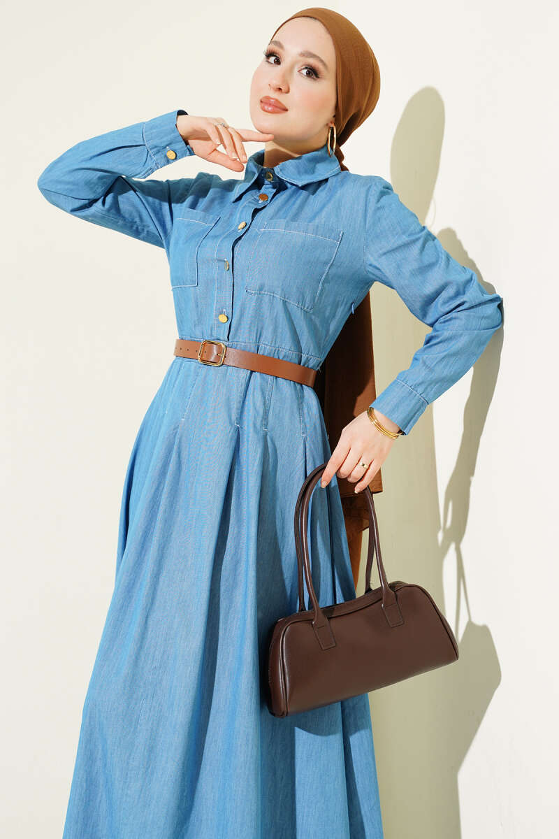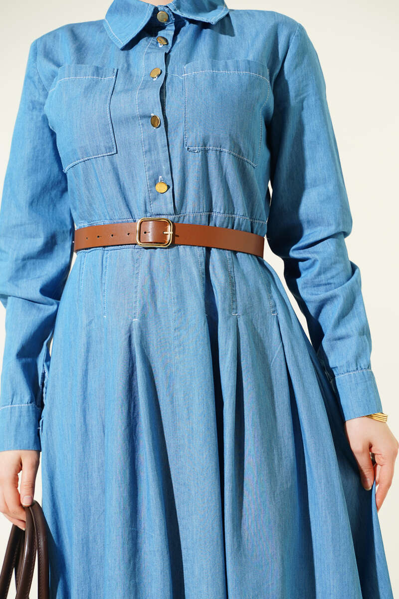 Çift Göğüs Cepli Düğmeli Kot Elbise Açık Mavi