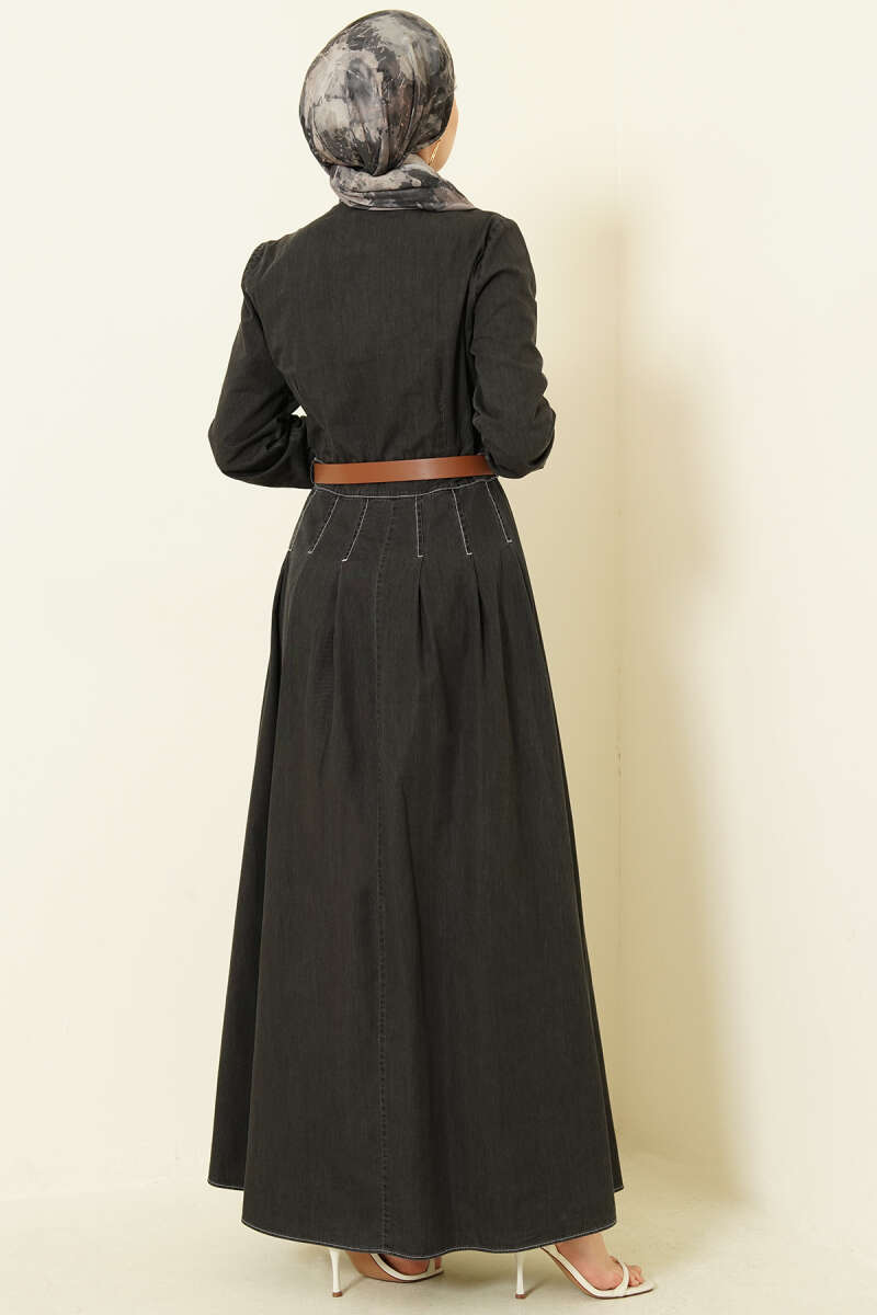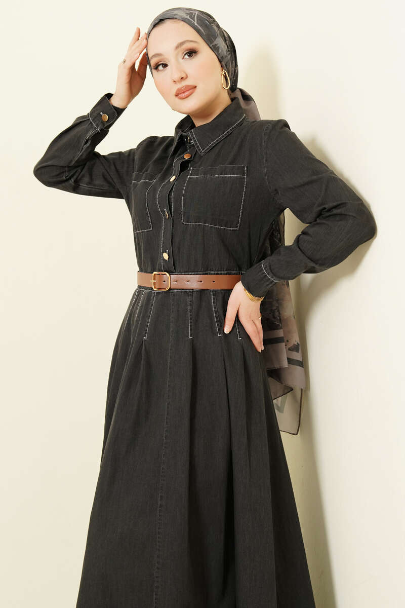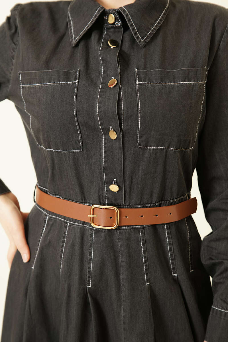 Kuşaklı Yarım Yaka Düğmeli Tensel Elbise Siyah