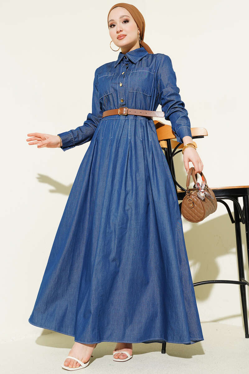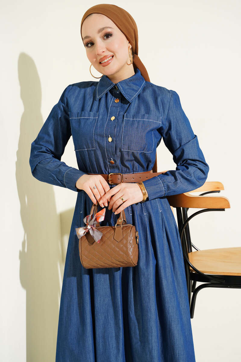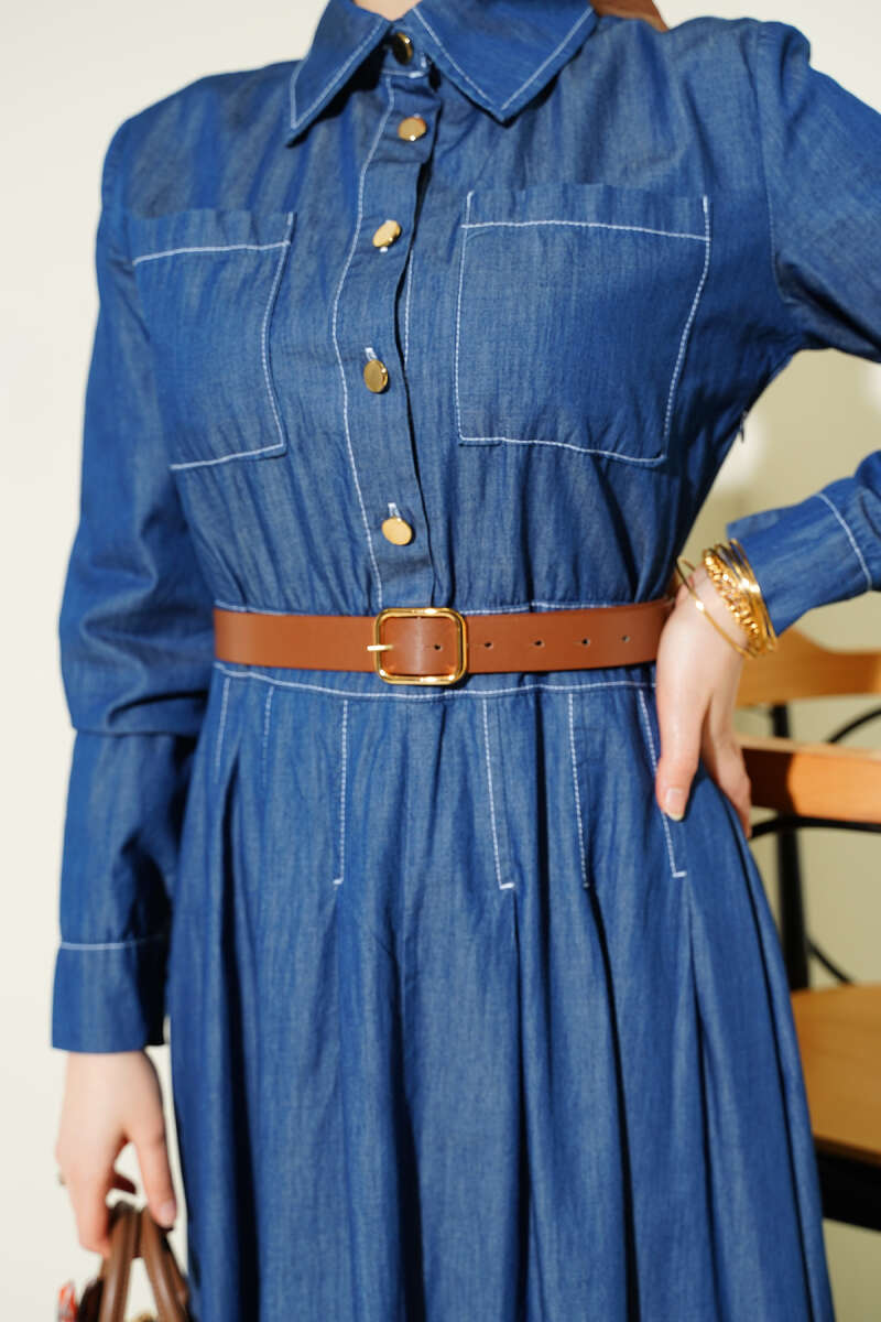 Çift Göğüs Cepli Düğmeli Kot Elbise Mavi