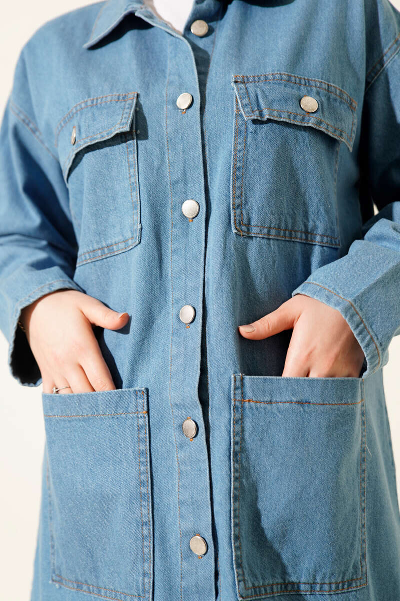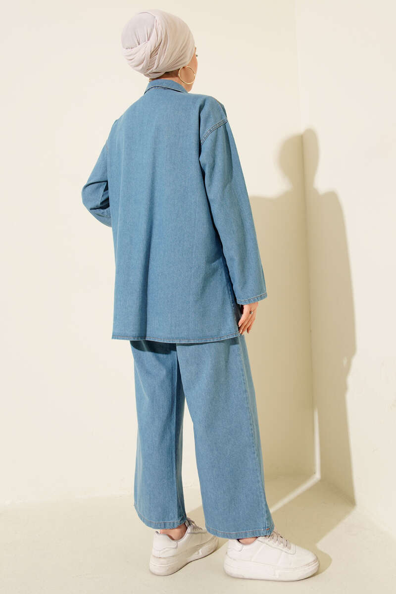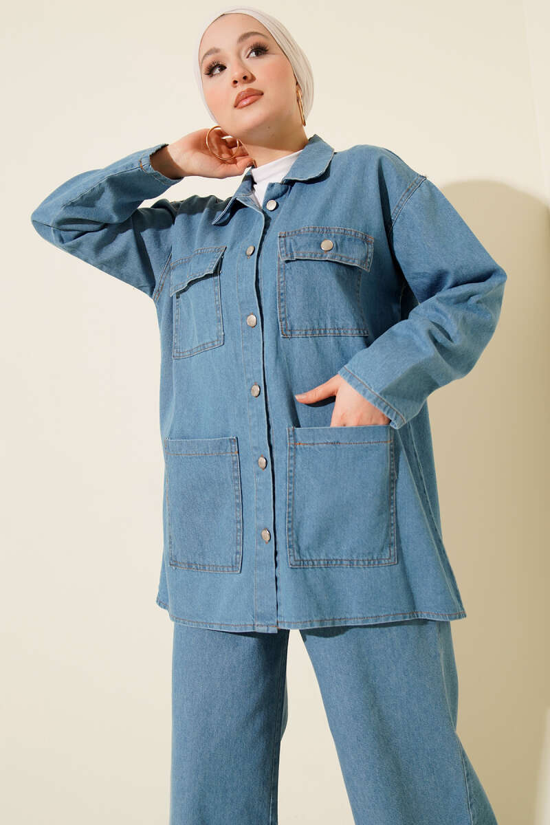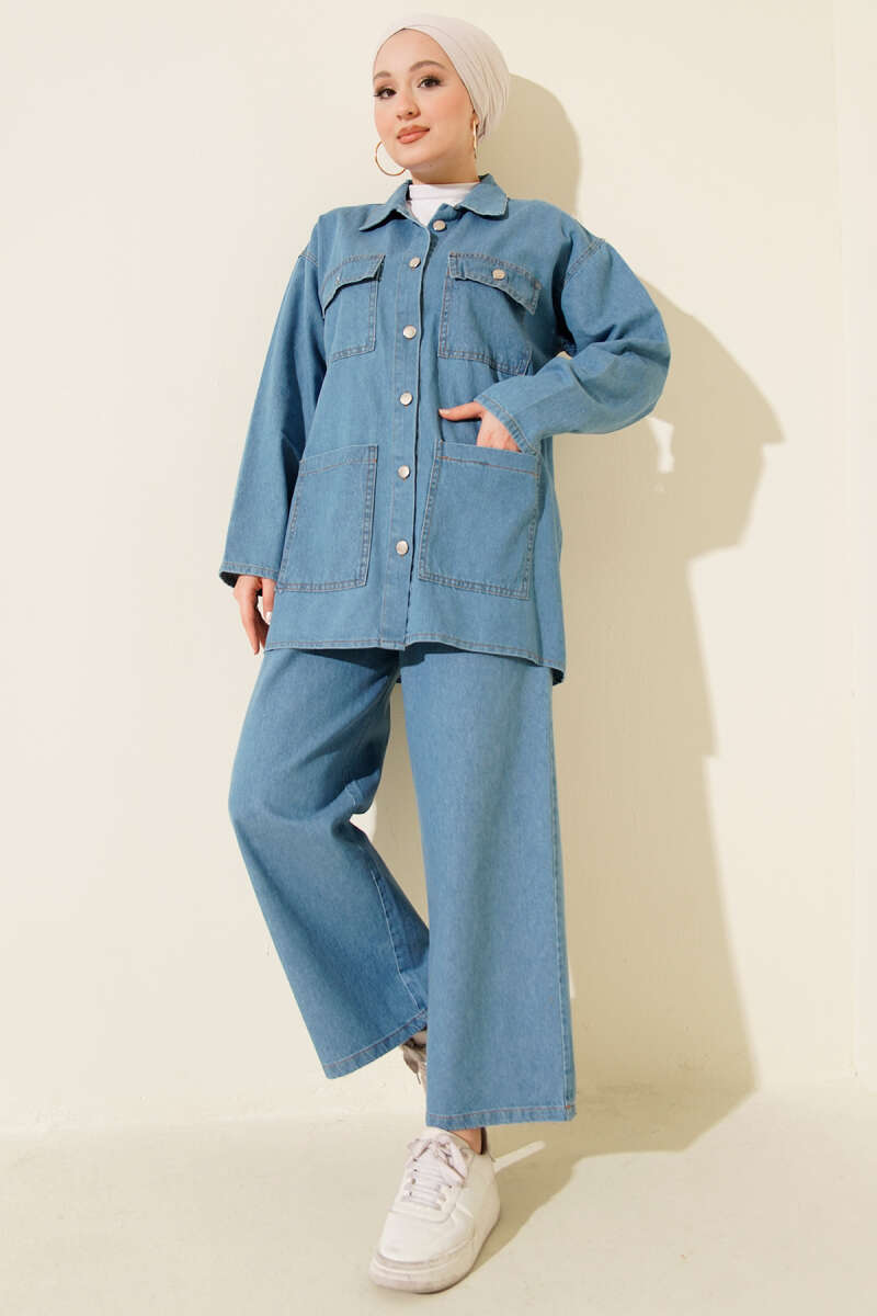 Çift Göğüs Cepli Kot İkili Takım Koyu Mavi