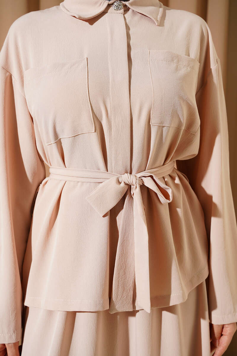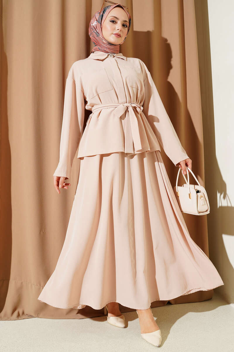 Çift Göğüs Cepli Kuşaklı Etekli Takım Siyah