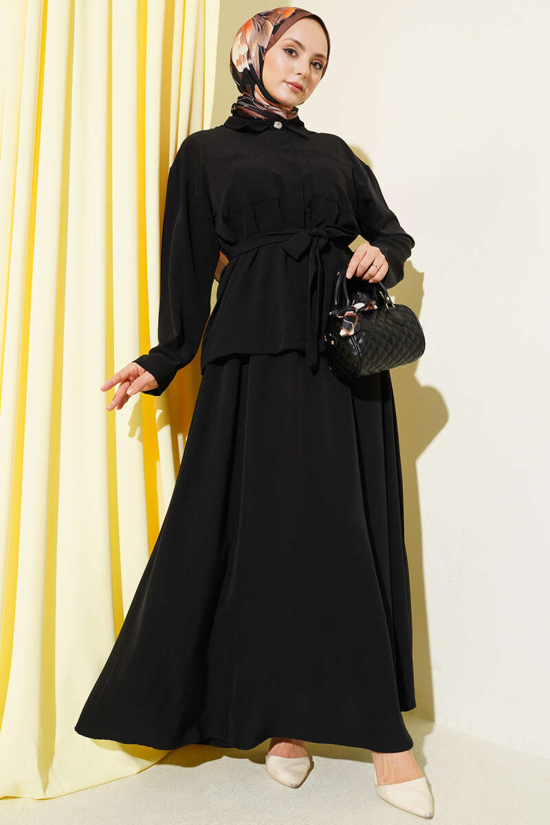 Mini Taş Süslemeli Kuşaklı İkili Takım Lacivert