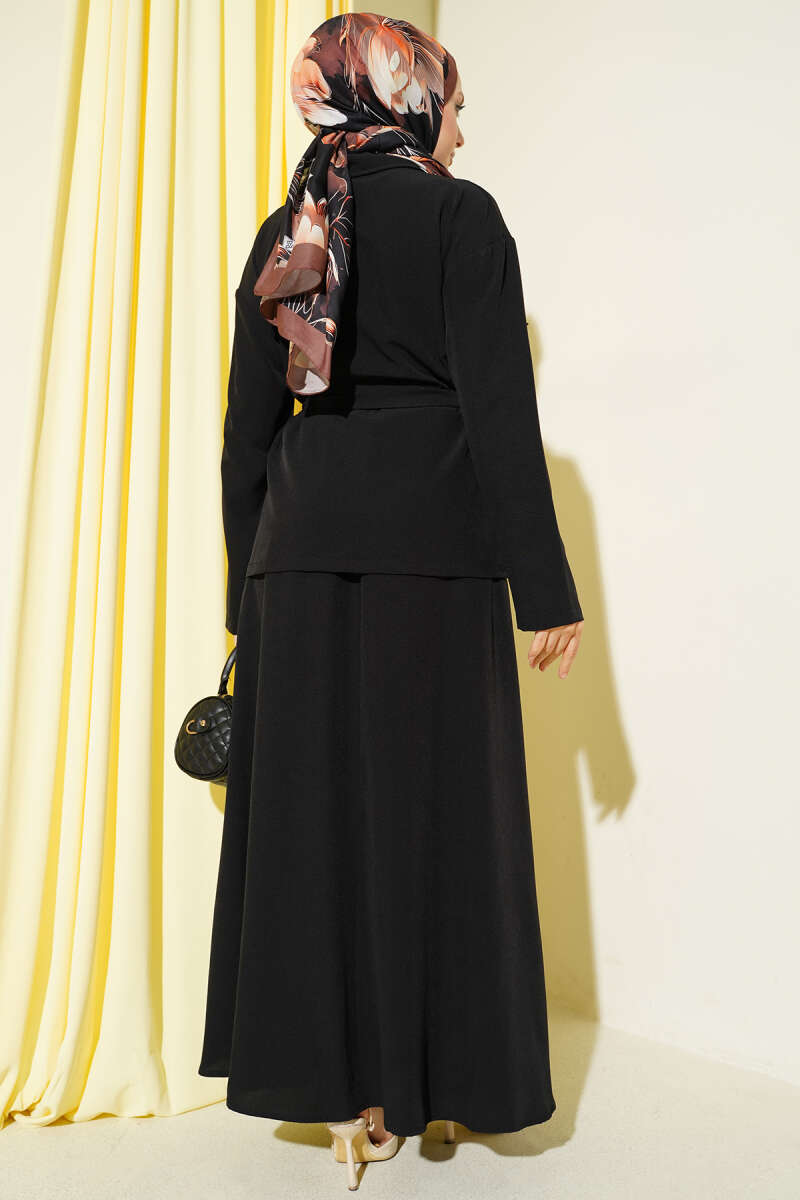 Çift Göğüs Cepli Kuşaklı Etekli Takım Lacivert