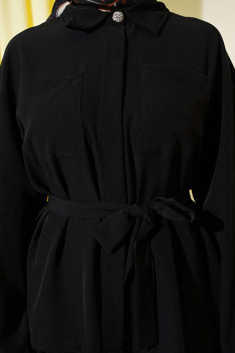 Yanları Tüllü Çift Yaka Gömlek Siyah