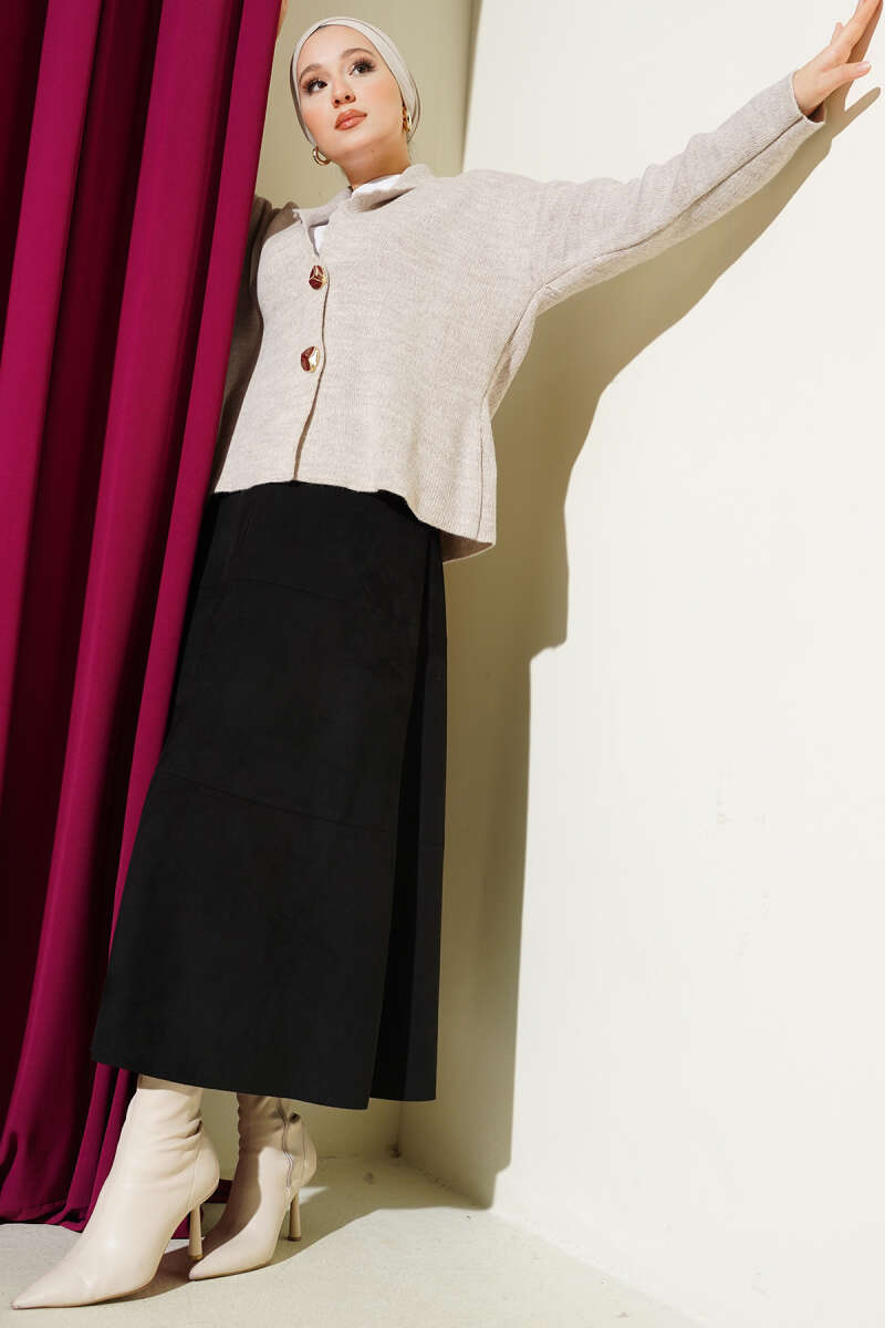 Gold Düğmeli Sakallı Triko Hırka Vizon