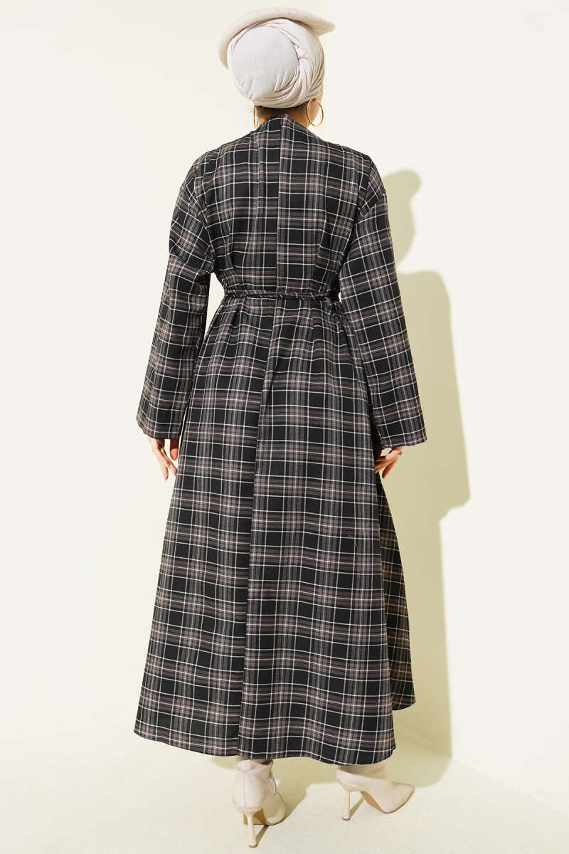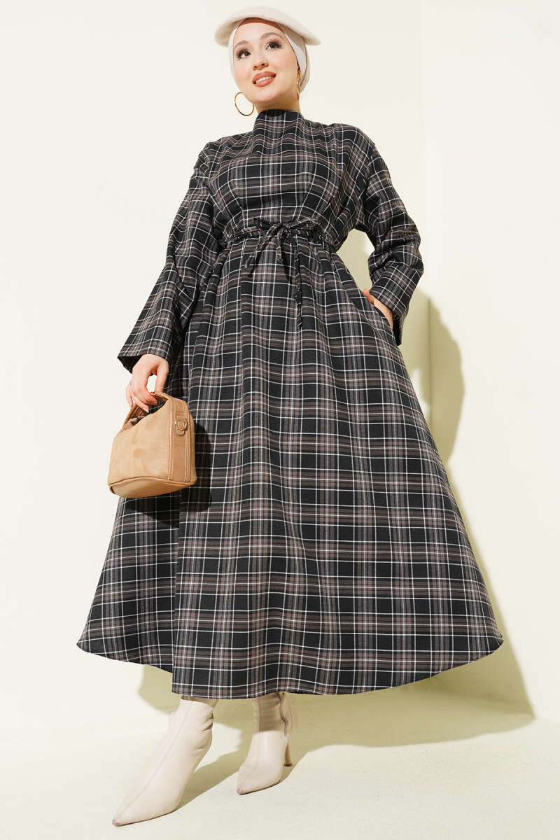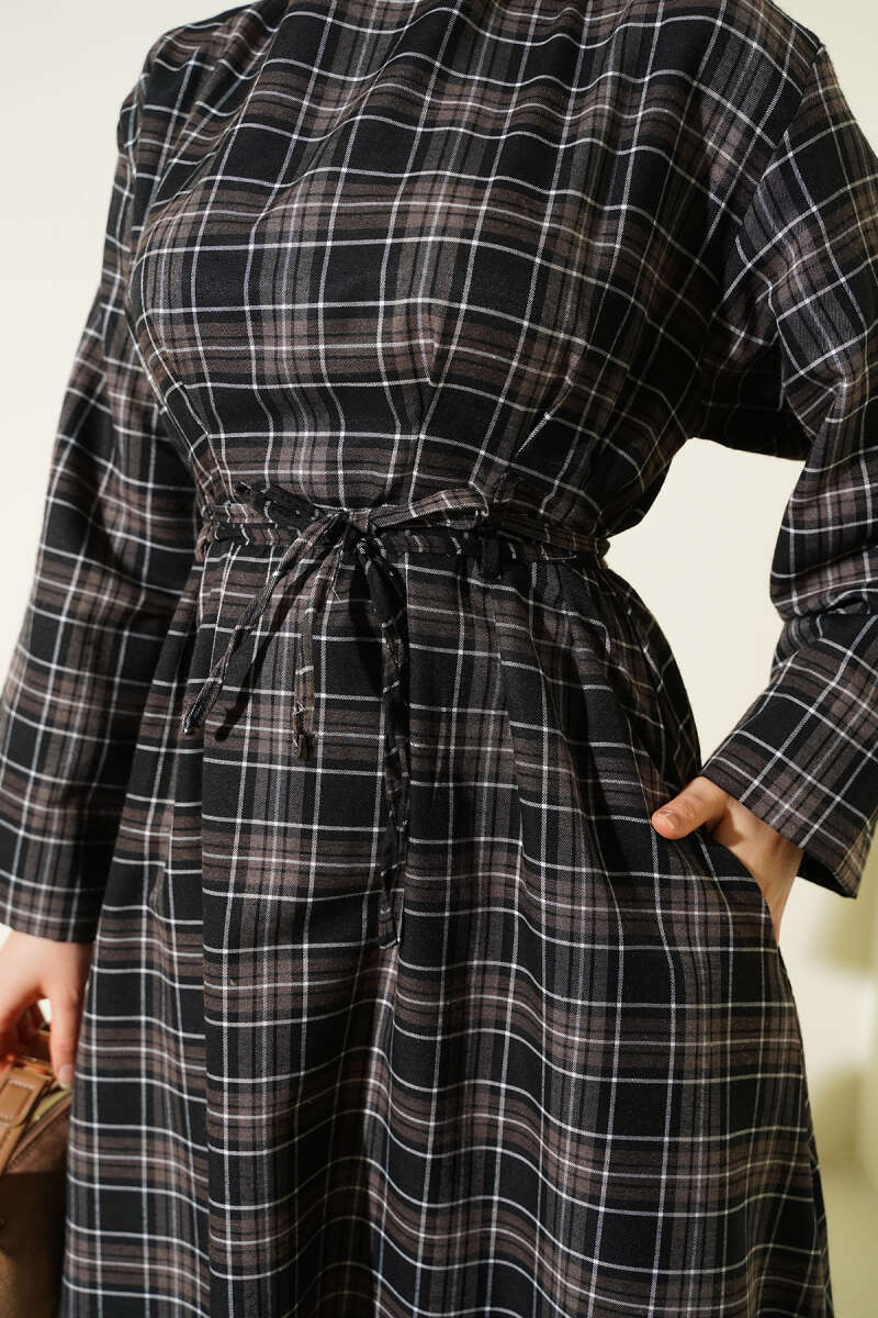 Çift İp Kuşaklı Ekoseli Elbise Siyah