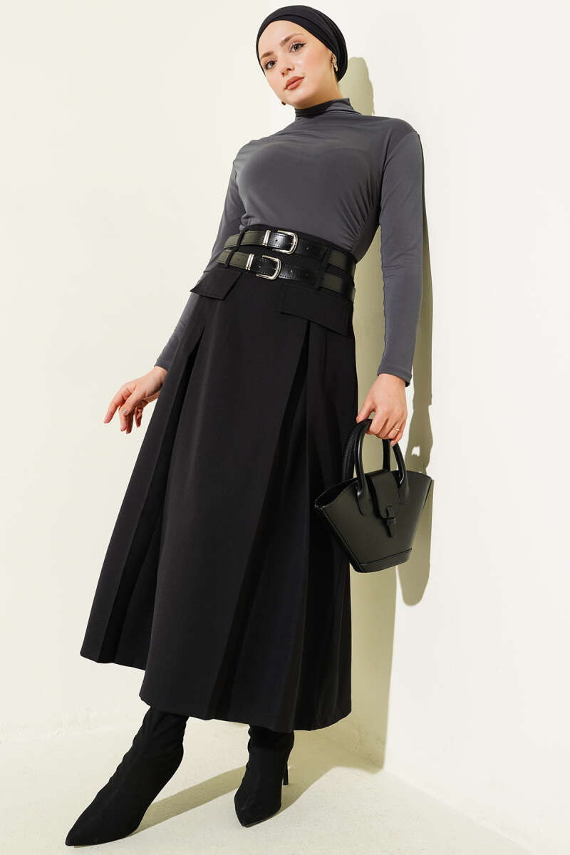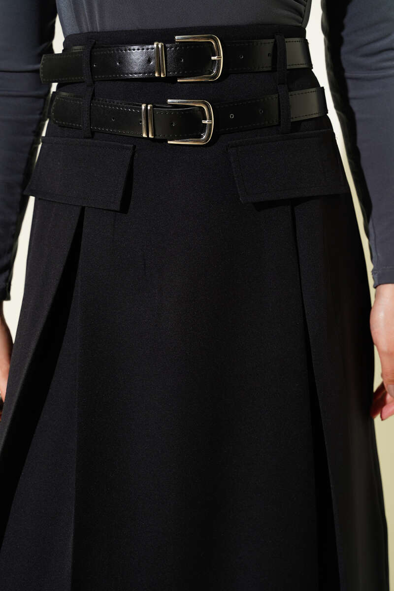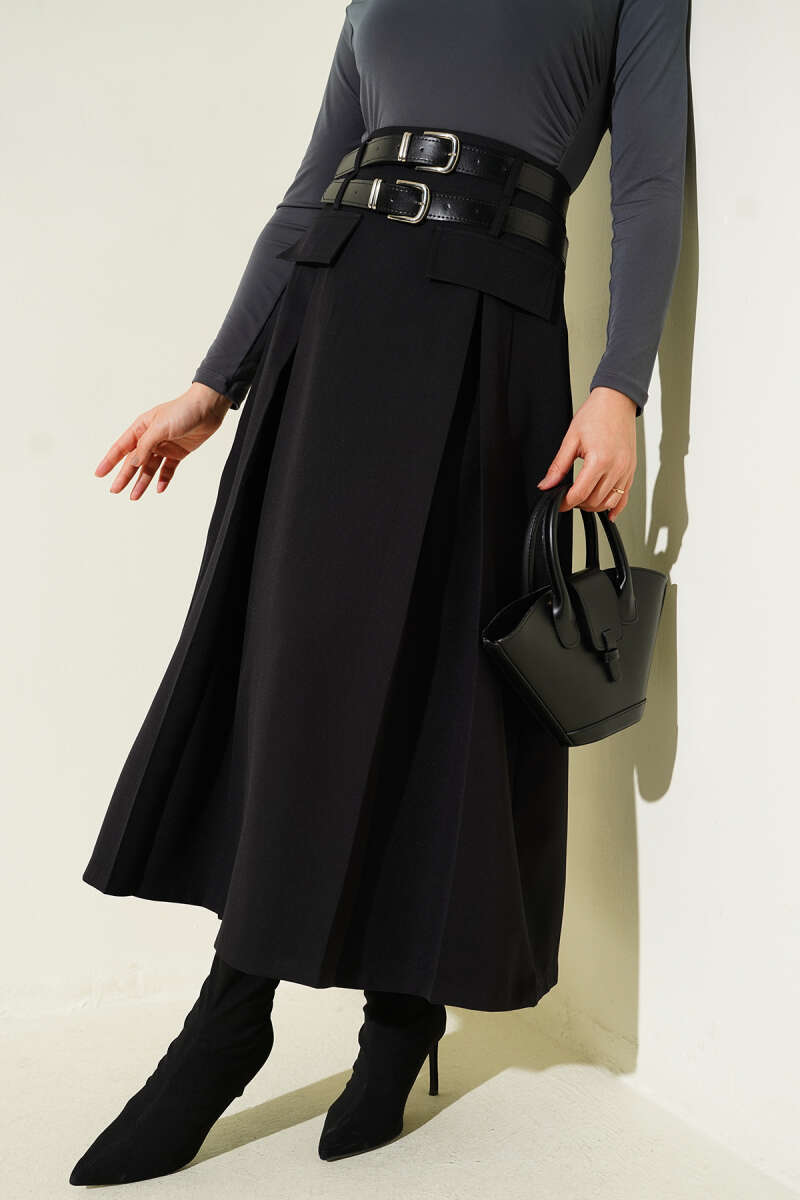 Piliseli Yan Kemer Detaylı Etek Siyah