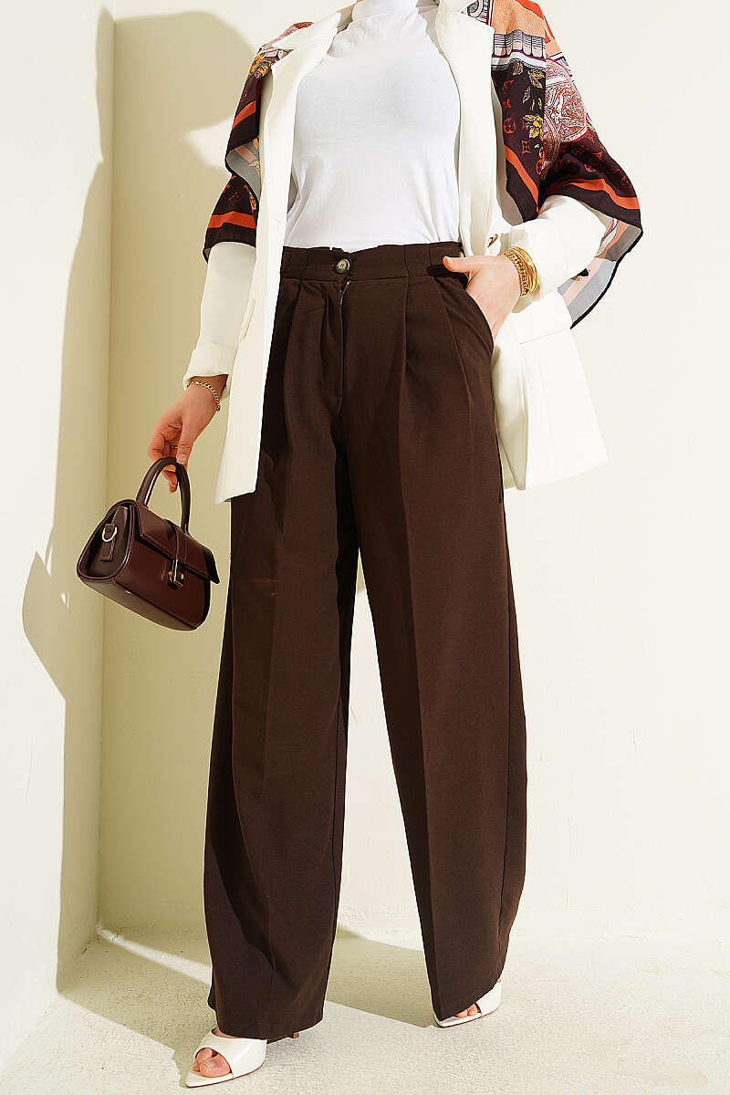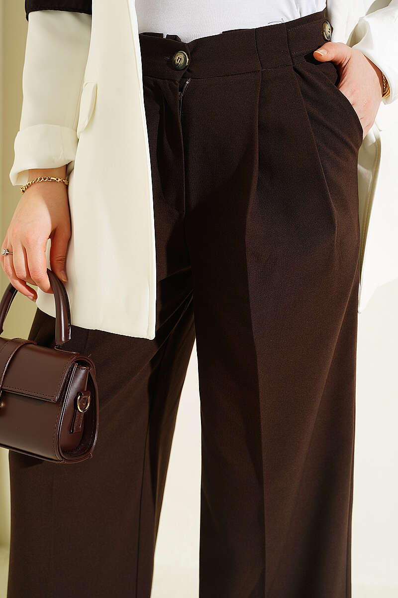 Çift Pileli Düğmeli Kumaş Pantolon Kahve